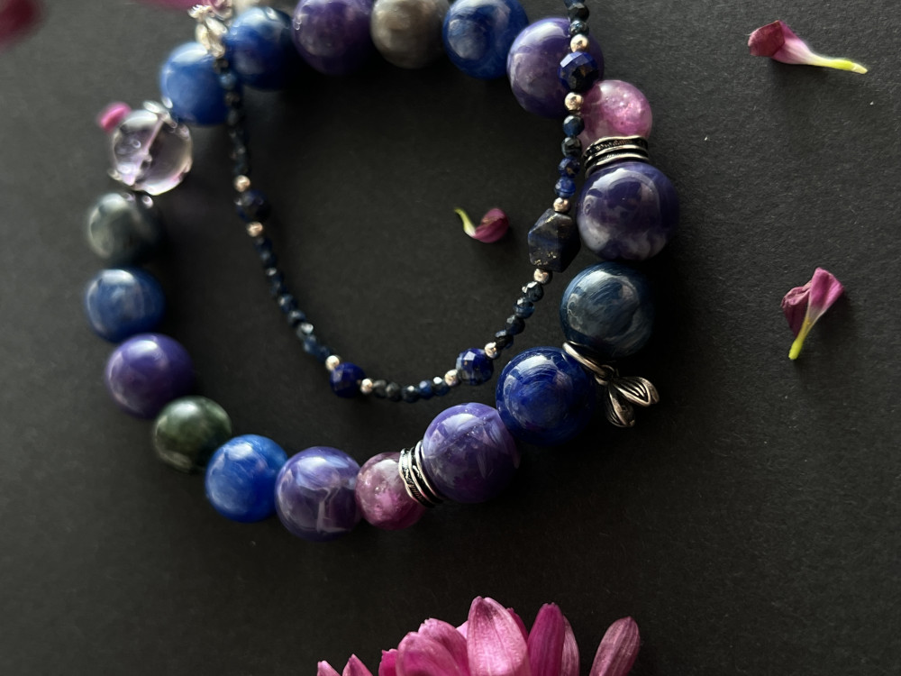 Браслет з квіткового Агату, полуничного кварцу, сонячного каменя двох видів, яшми