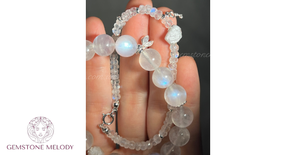 Набір браслетів з натуральних каменів та срібла, рожеві, світлі відтінки