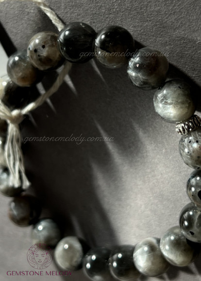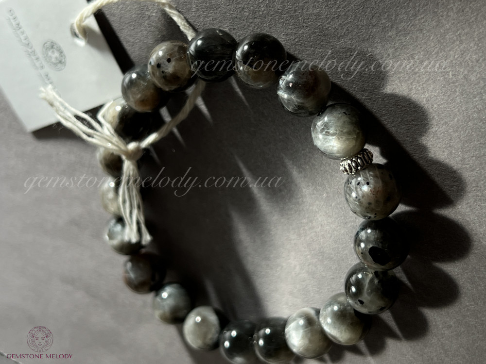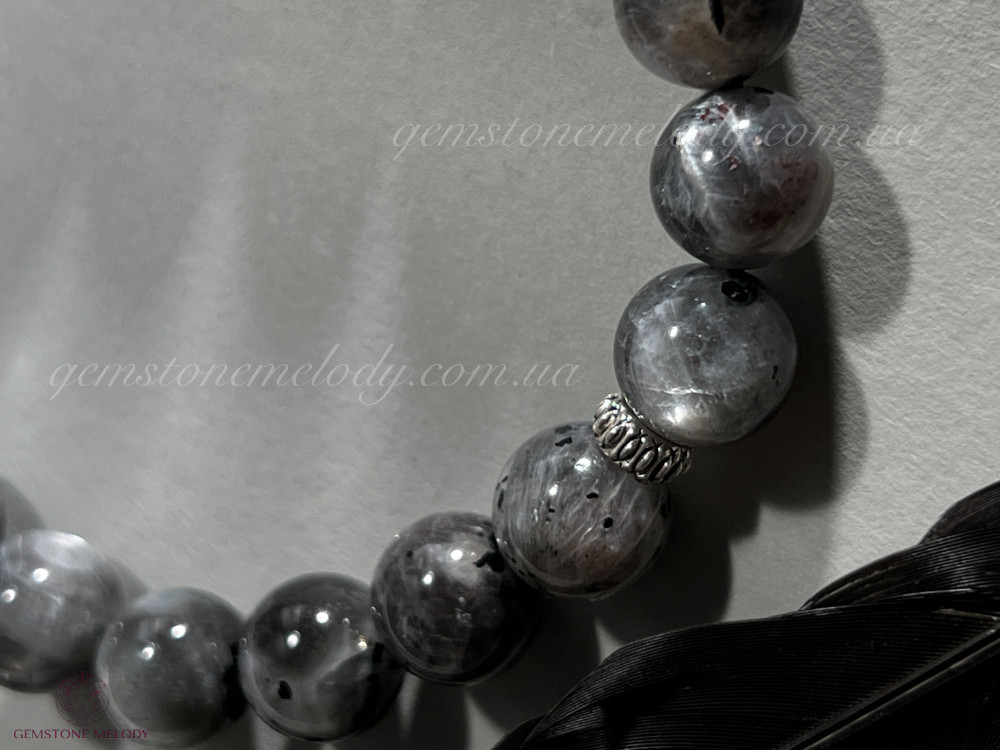 •поєднання двох мінералів одночасно в одній намистині: чорний сонячний камінь(в ньому і місячний камінь) 10.5мм;