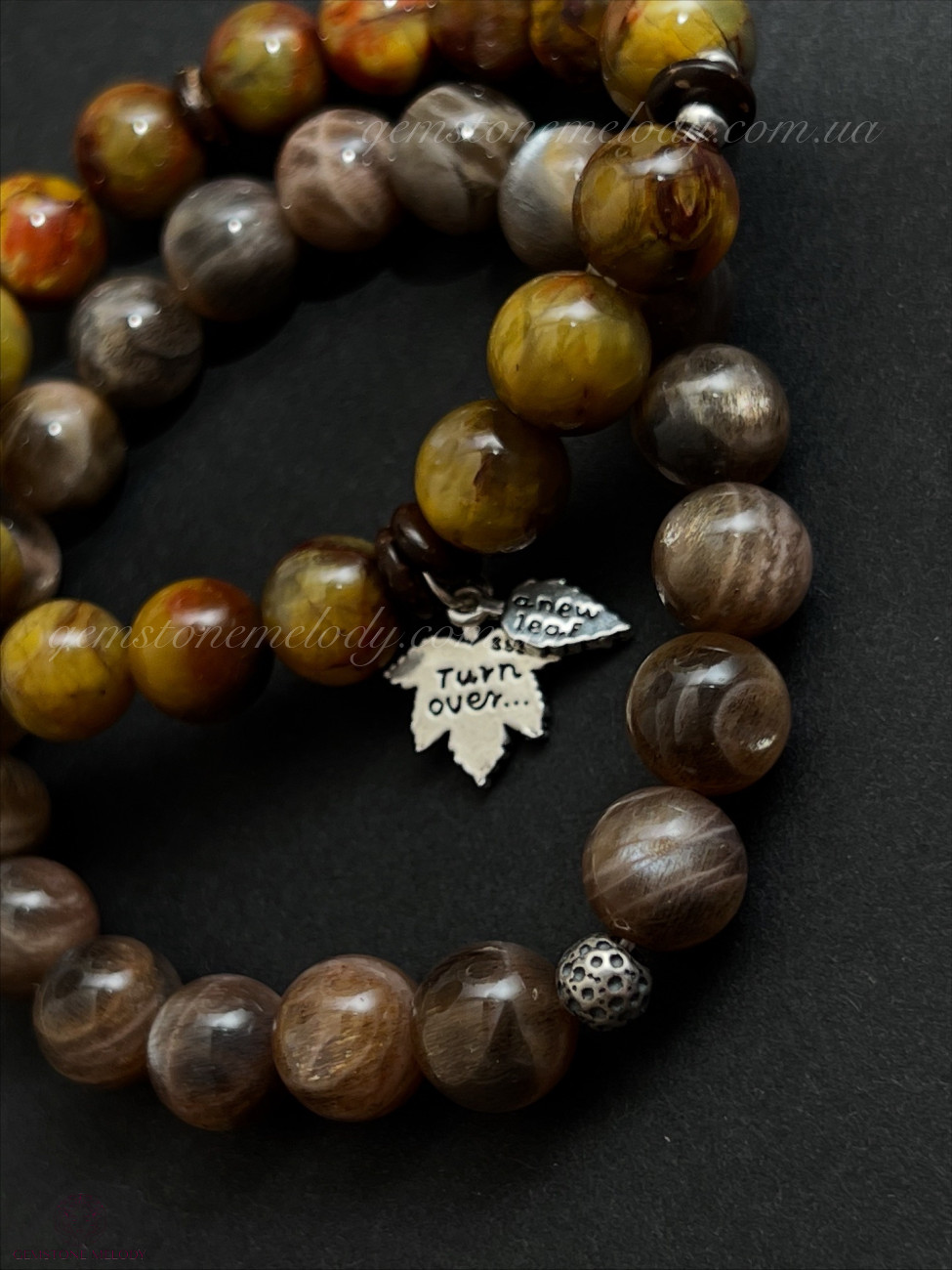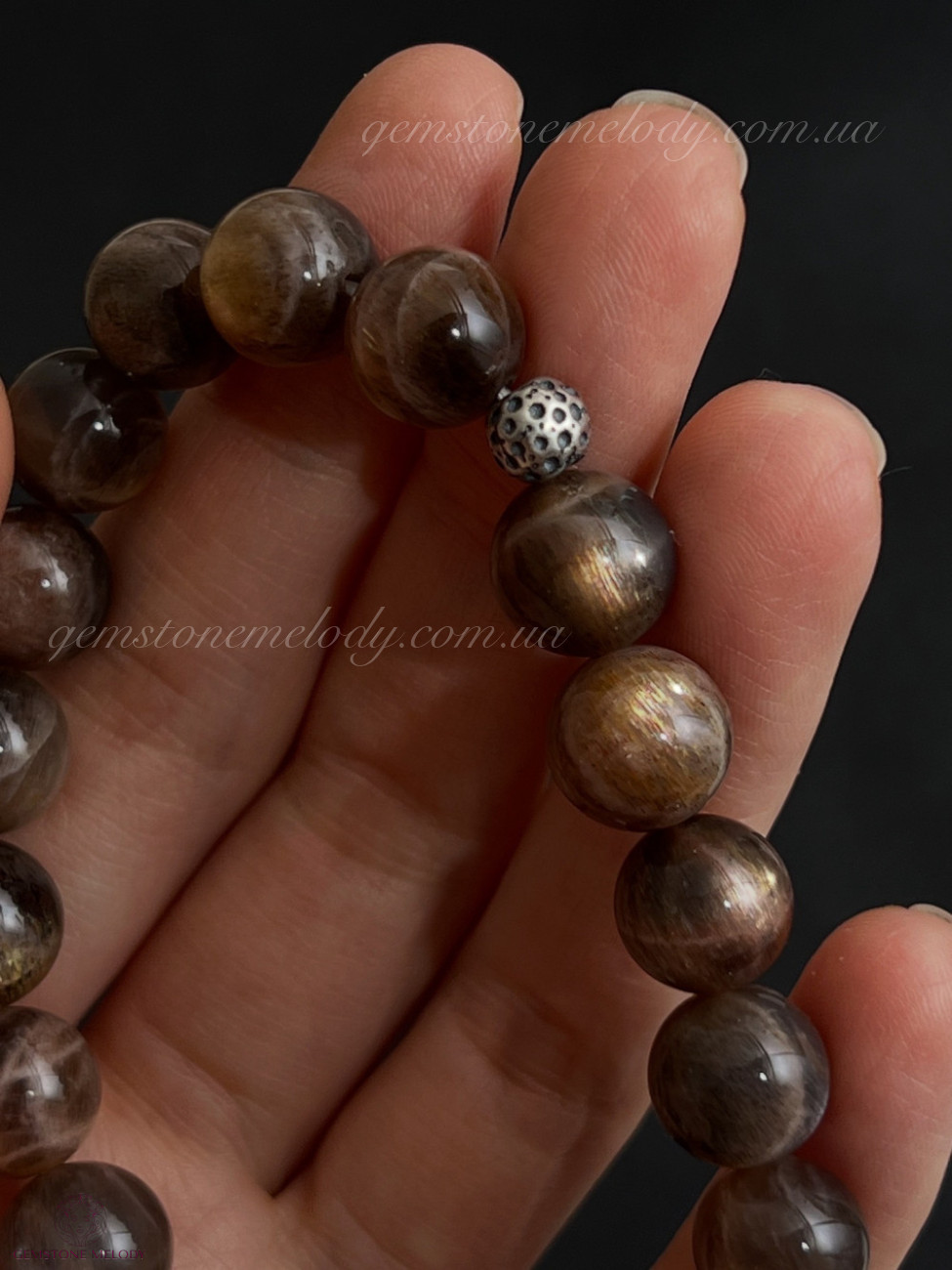 •поєднання двох мінералів одночасно в одній намистині: чорний сонячний камінь(в ньому і місячний камінь) 10мм;