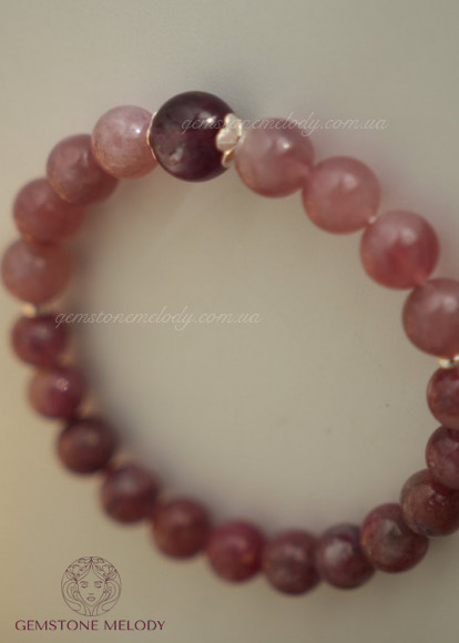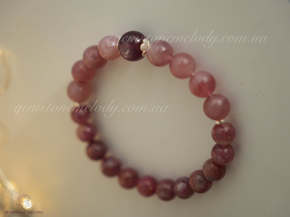 про браслетик на резинці: рожевий мадагаскарський кварц і турмалін, доповнені лепідолітом і сріблом; 1240 ГРН