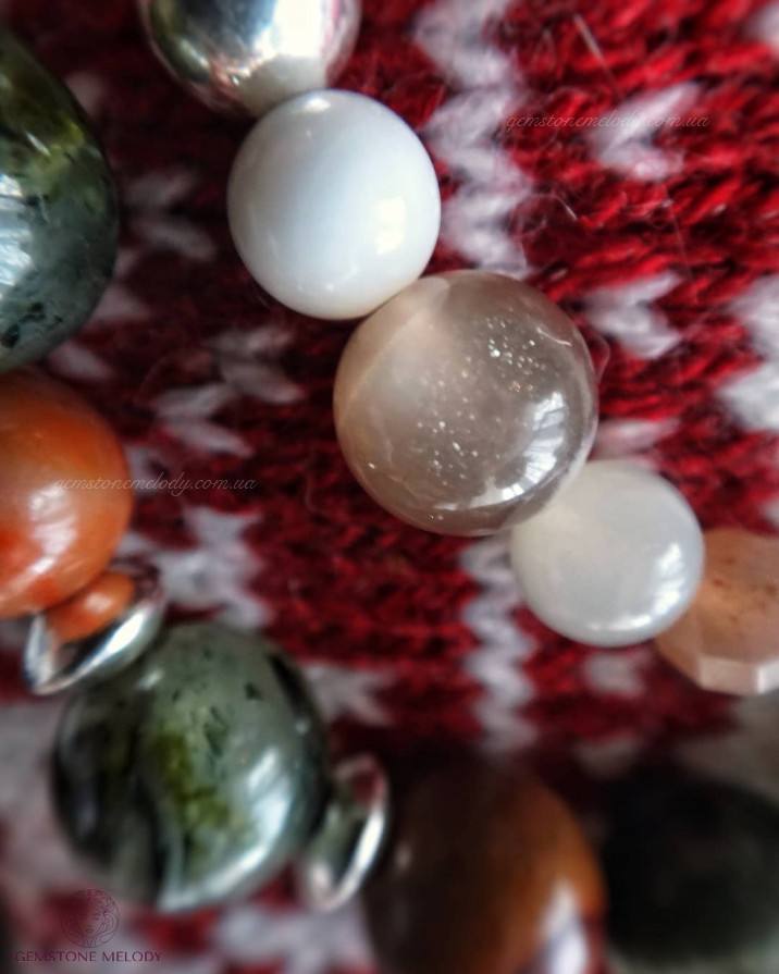 2) фурнитура серебро, солнечный камень, лунный камень, перламутр, на замочке.