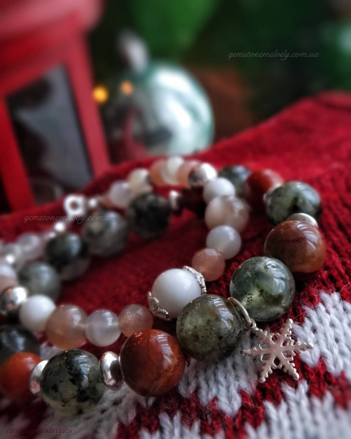 ...Создавая браслеты на фото, я представляла: в зелёном прените хвою, в коричнево-красном мукаите плодородную землю, а нежный тонкий браслет- это хрупкие игрушки, где солнечные камни изящно играют в ветвях.