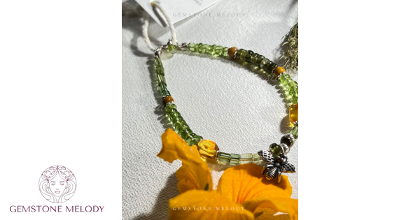 Браслет з зеленого турмаліну двох видів , вставки бурштину