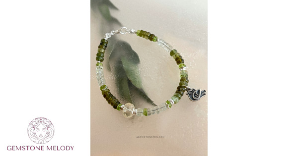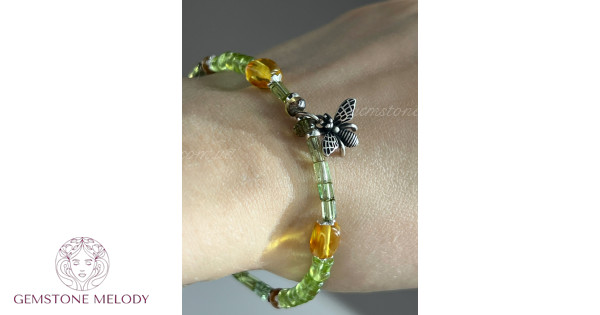Браслет з зеленим турмаліном, хризолітом, бурштином
