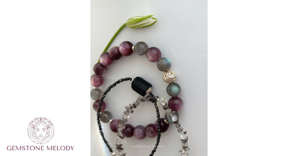 Набір браслетів з натуральних каменів та срібла, лепідоліт, лабрадор і інші