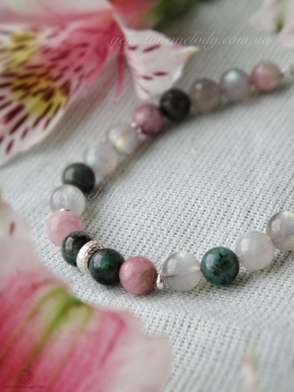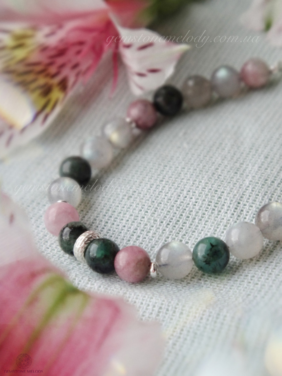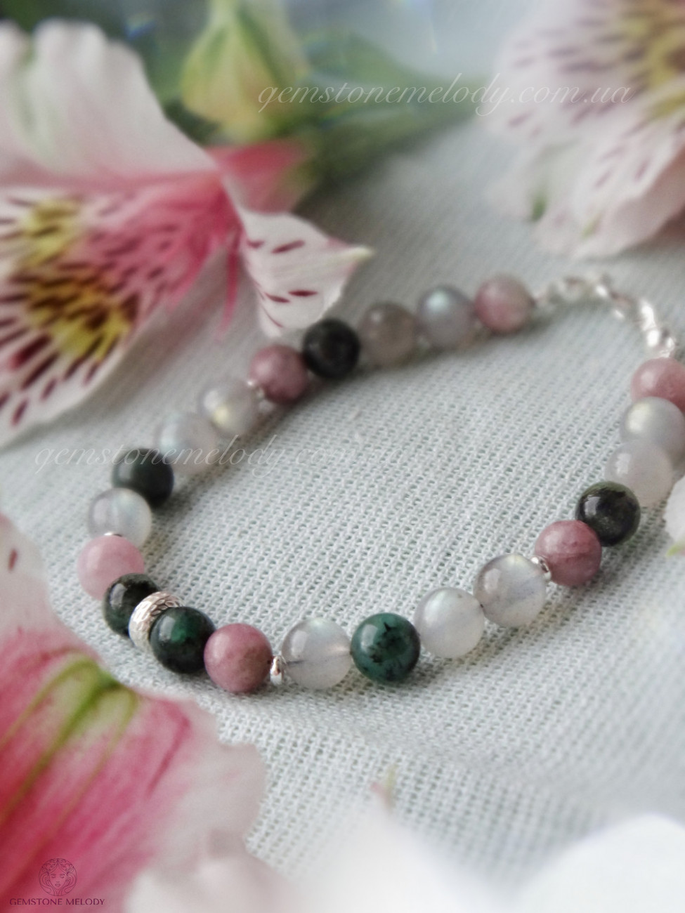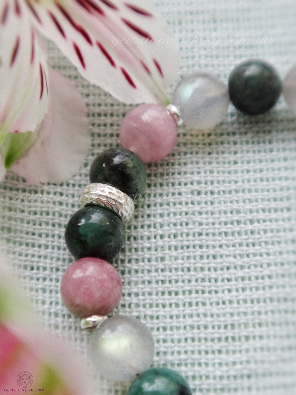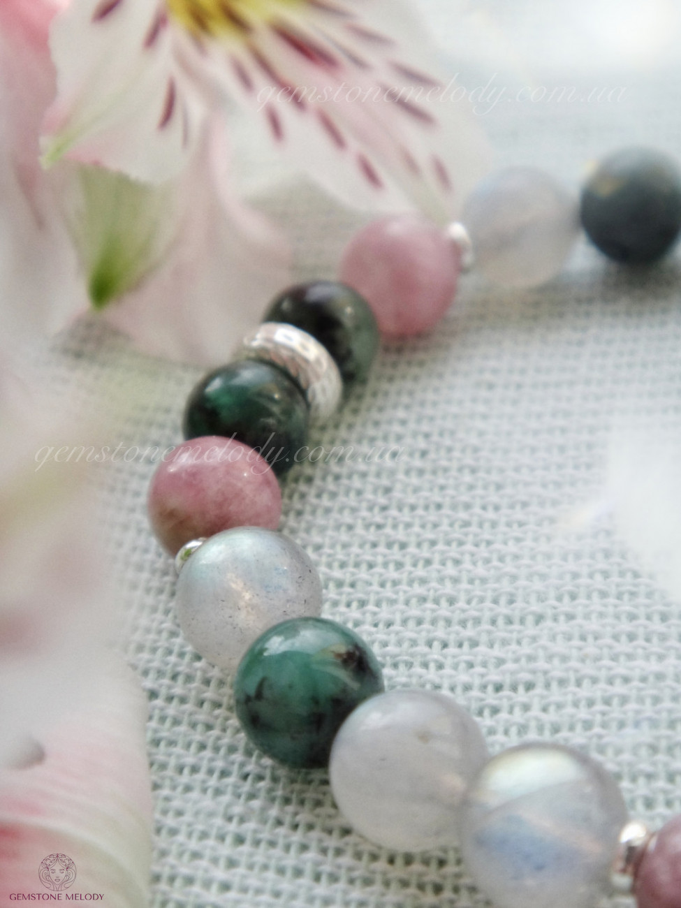 Браслет на резинке, фурнитура серебро 925 пробы. Натуральные камни: изумруд, лабрадор, турмалин розовый ( рубеллит ). Размер камней 6-7мм.