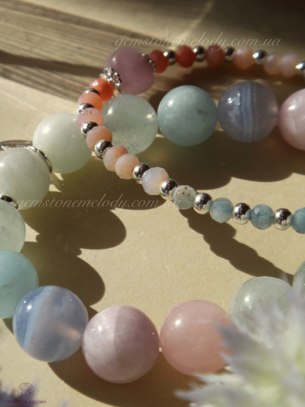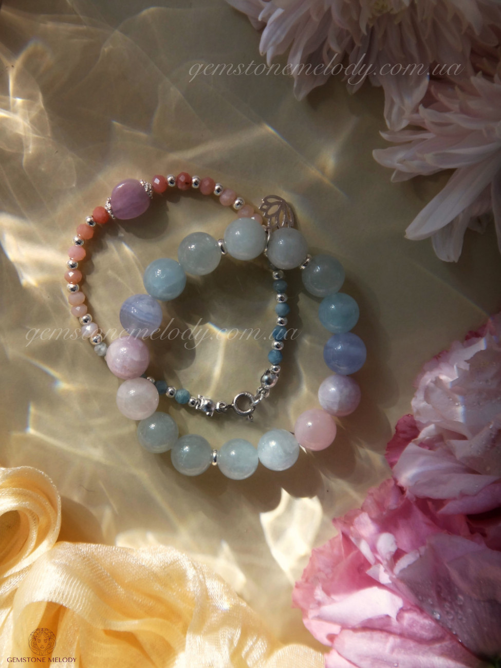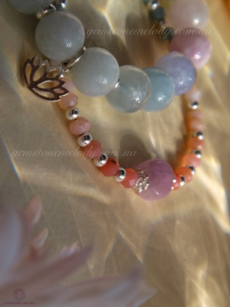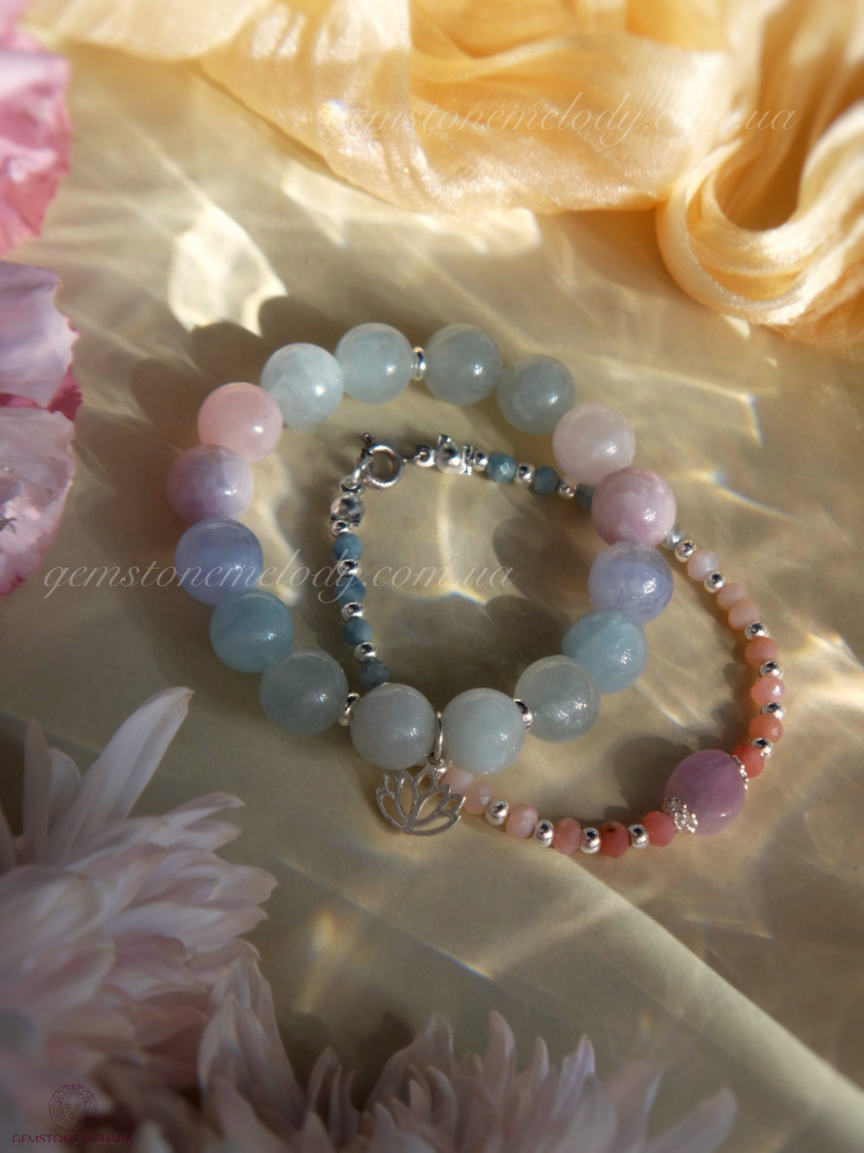 аквамарин, розовый кварц, кунцит, голубой кружевной агат, серебро 925 пробы, на резинке.