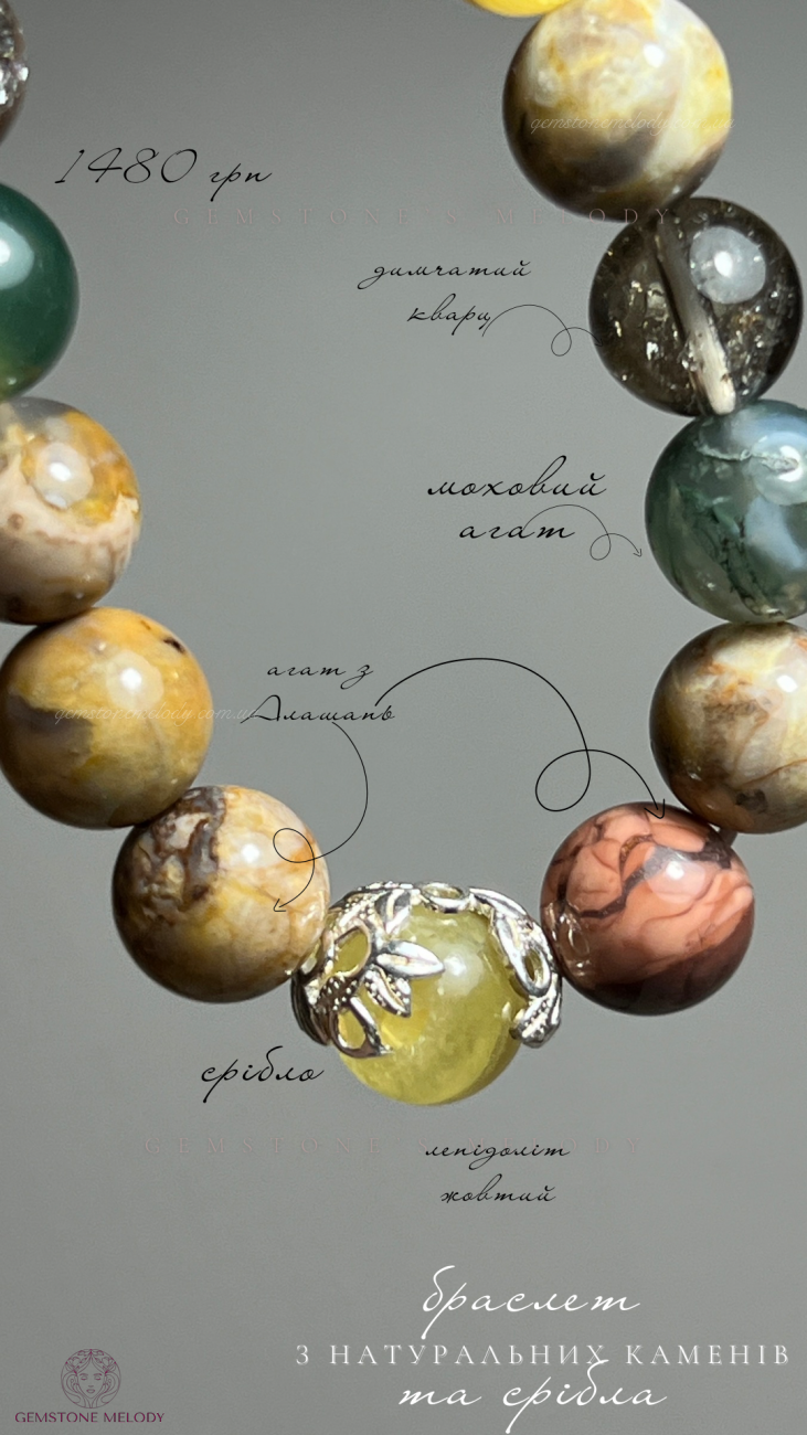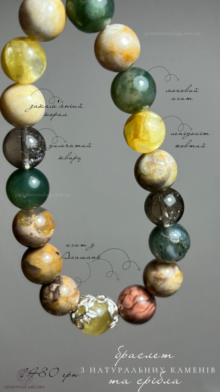 лепідоліт жовтий високої якості 11мм, з Алашань рідкісний агат неначе кракелюр 11мм, вставки могового агату 11мм, димчатий кварц 10мм; закамʼянілий корал 10мм; срібло 925 проби;