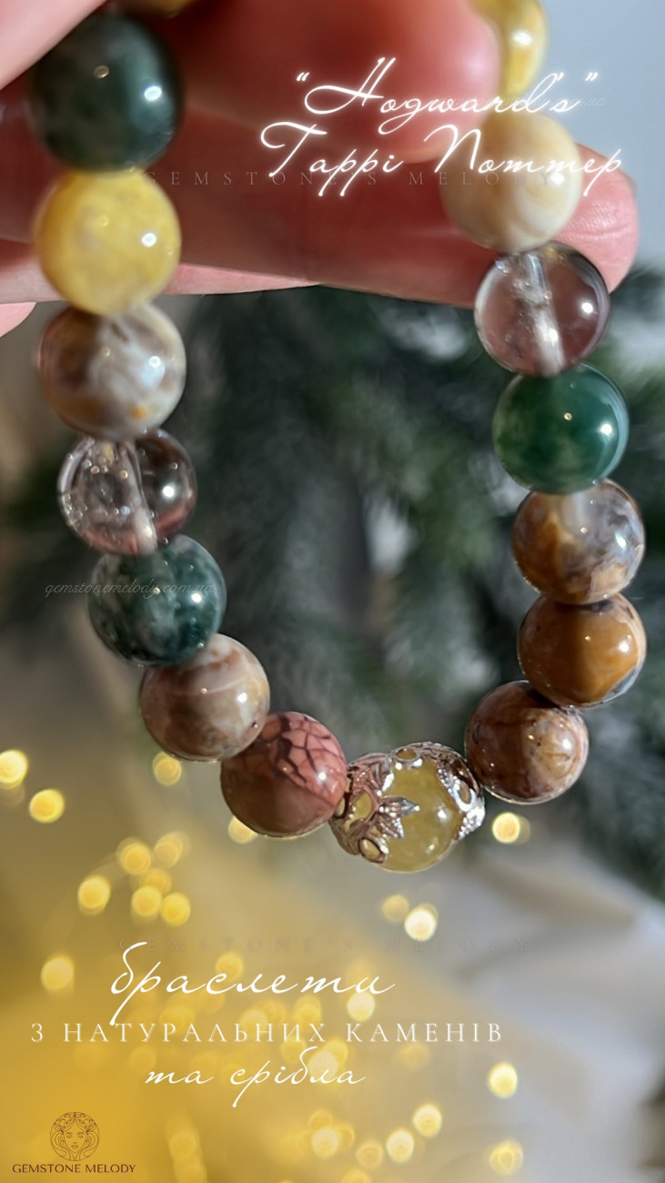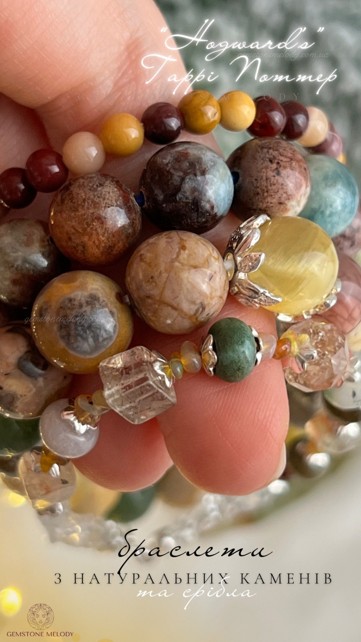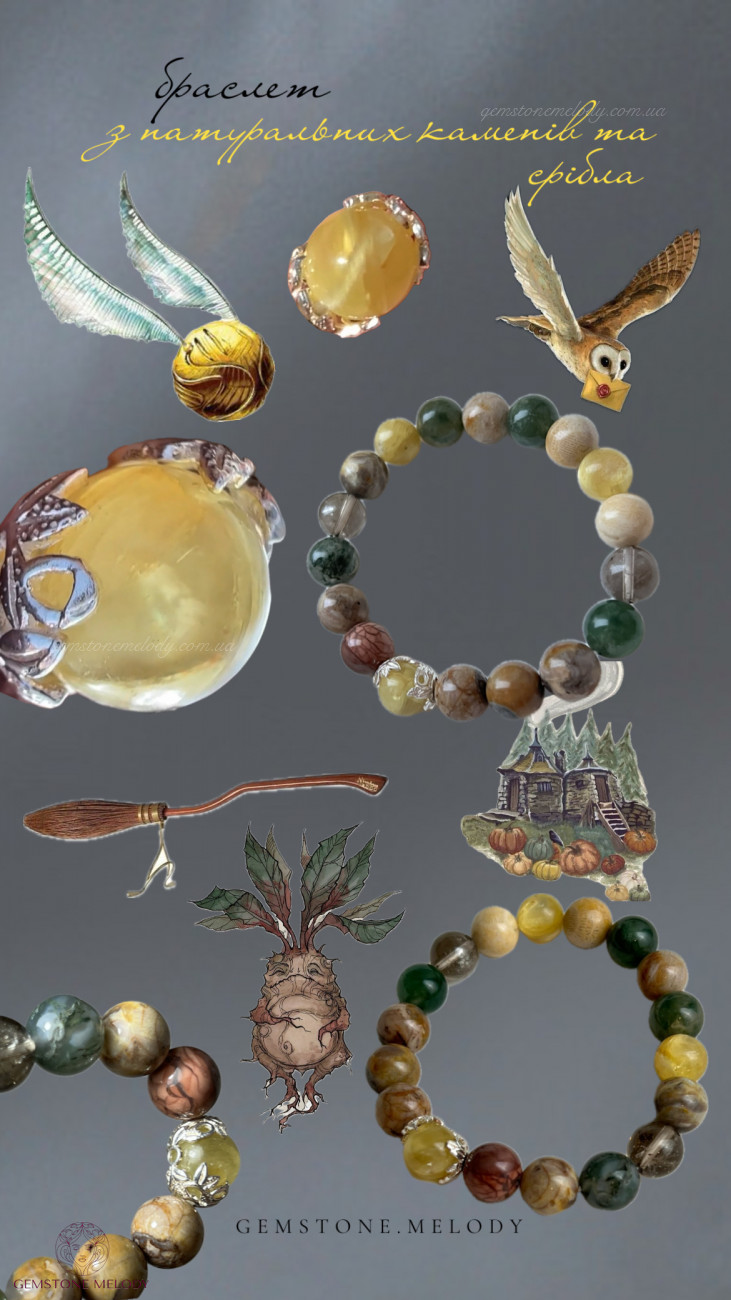 Головний браслет з зимової колекції. Жовтий лепідоліт ненача мʼяч снітч, символ перемоги. Агат повторює структуру замку. Моховий Агат нагадує про загадковий ліс