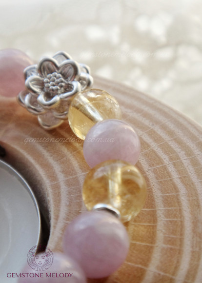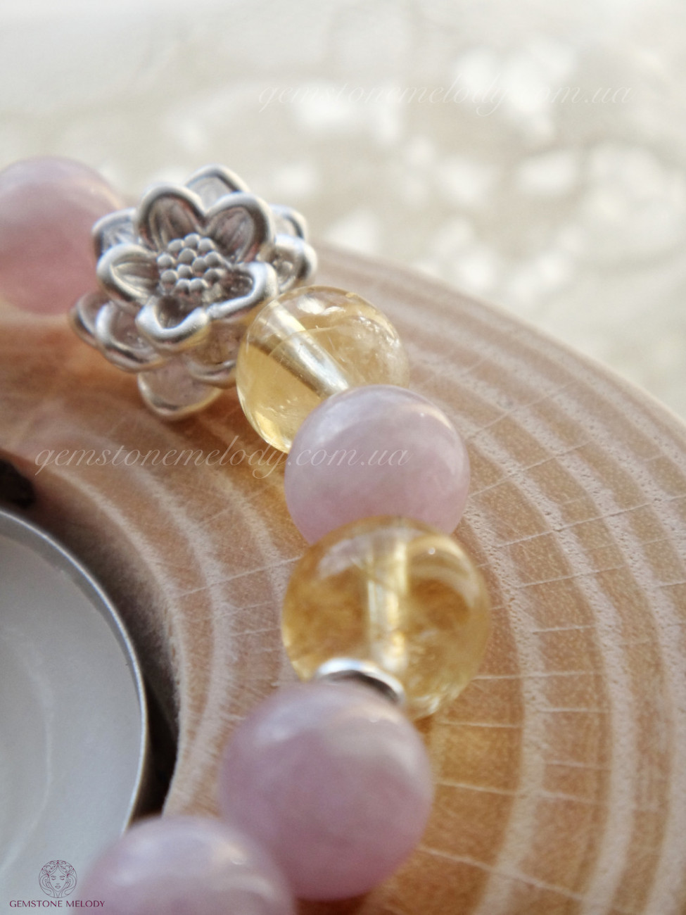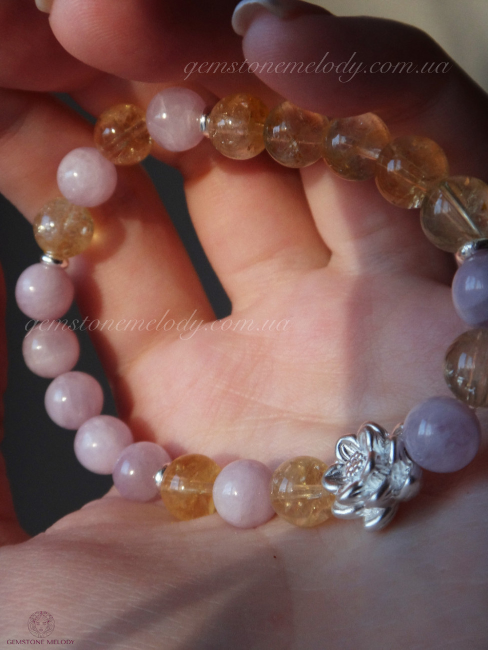 Браслет на резинке, фурнитура серебро 999 пробы. Натуральные камни диаметром 8мм: кунцит, цитрином