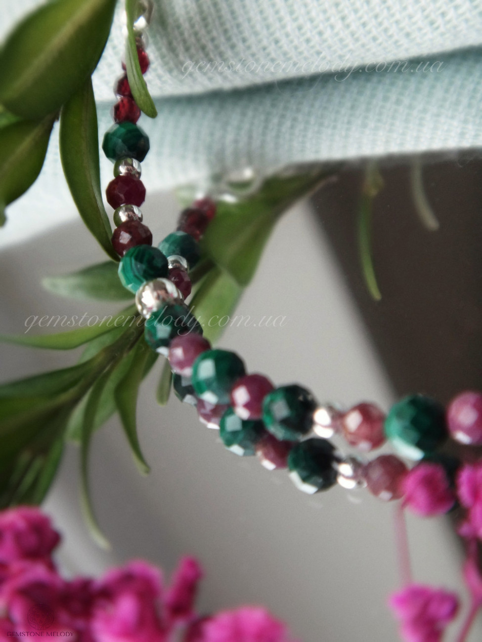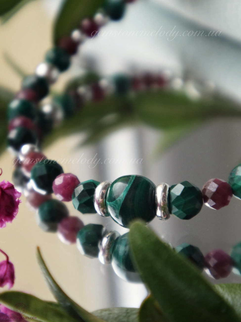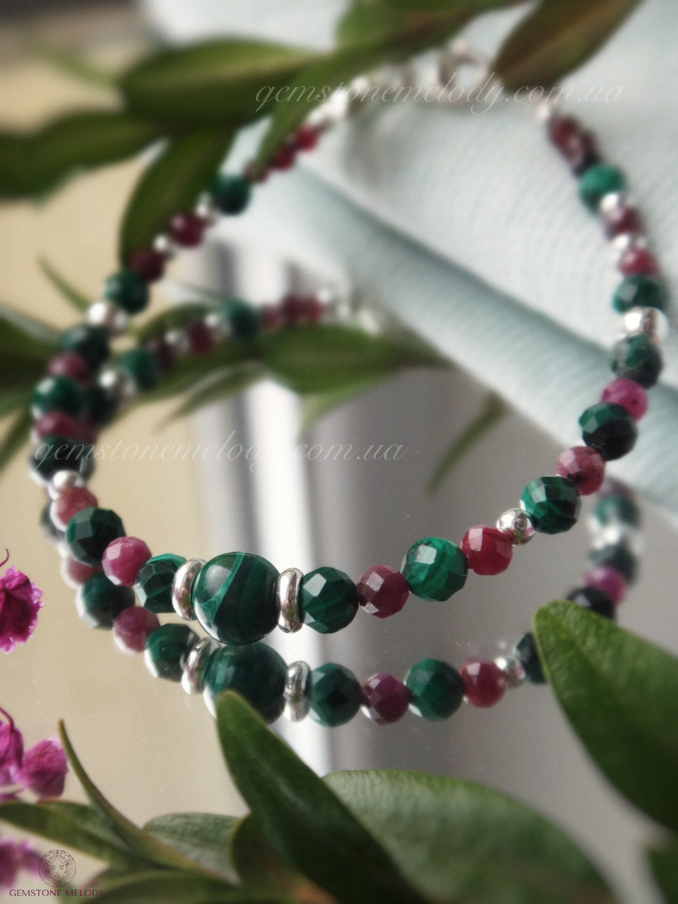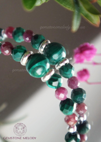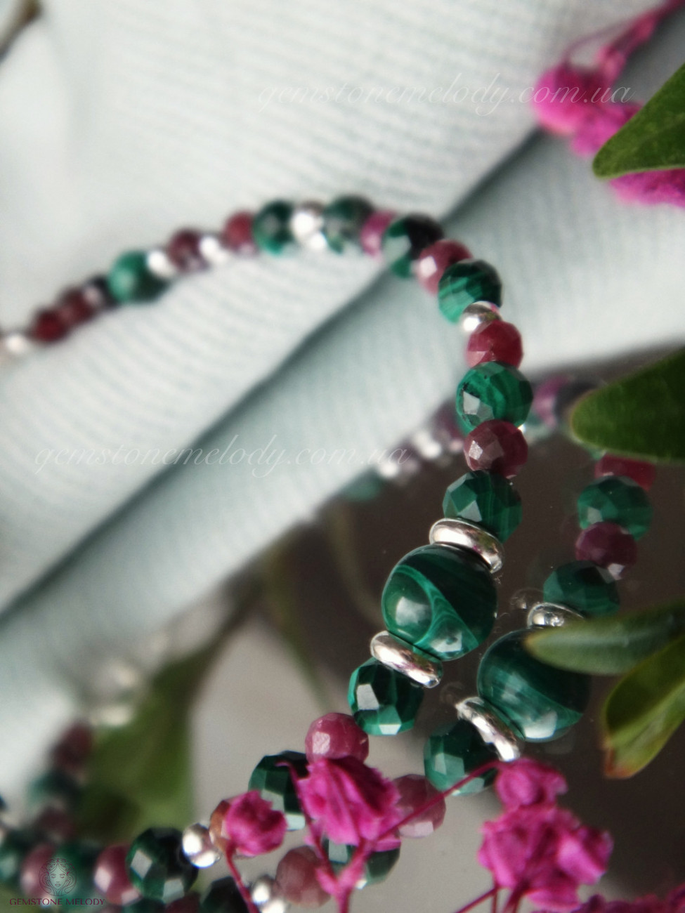 Браслет на замочке, фурнитура серебро 925 пробы. Натуральные камни 6мм и 4×4мм малахит, 3×3мм рубин.