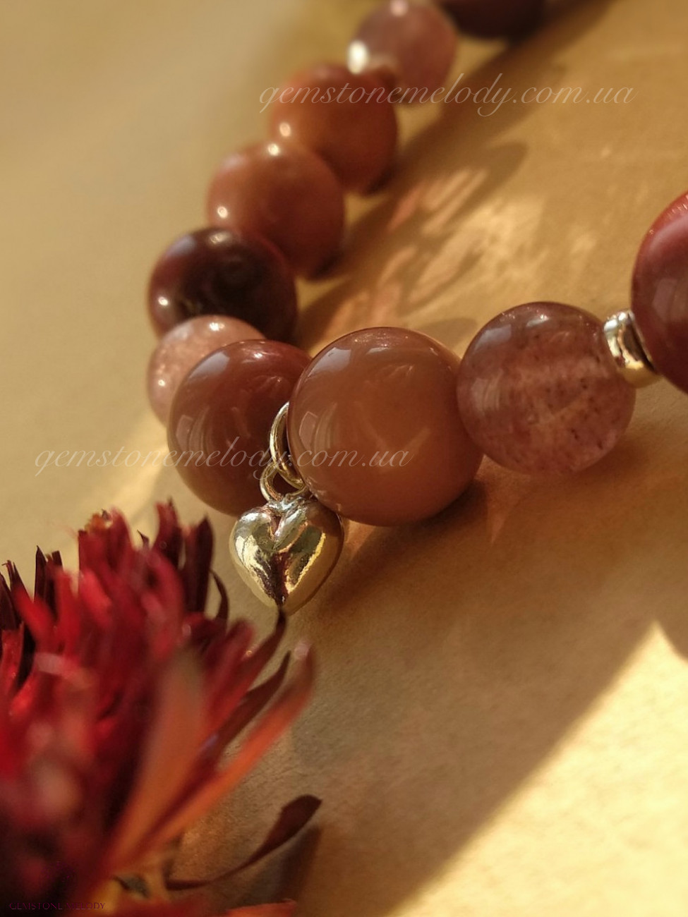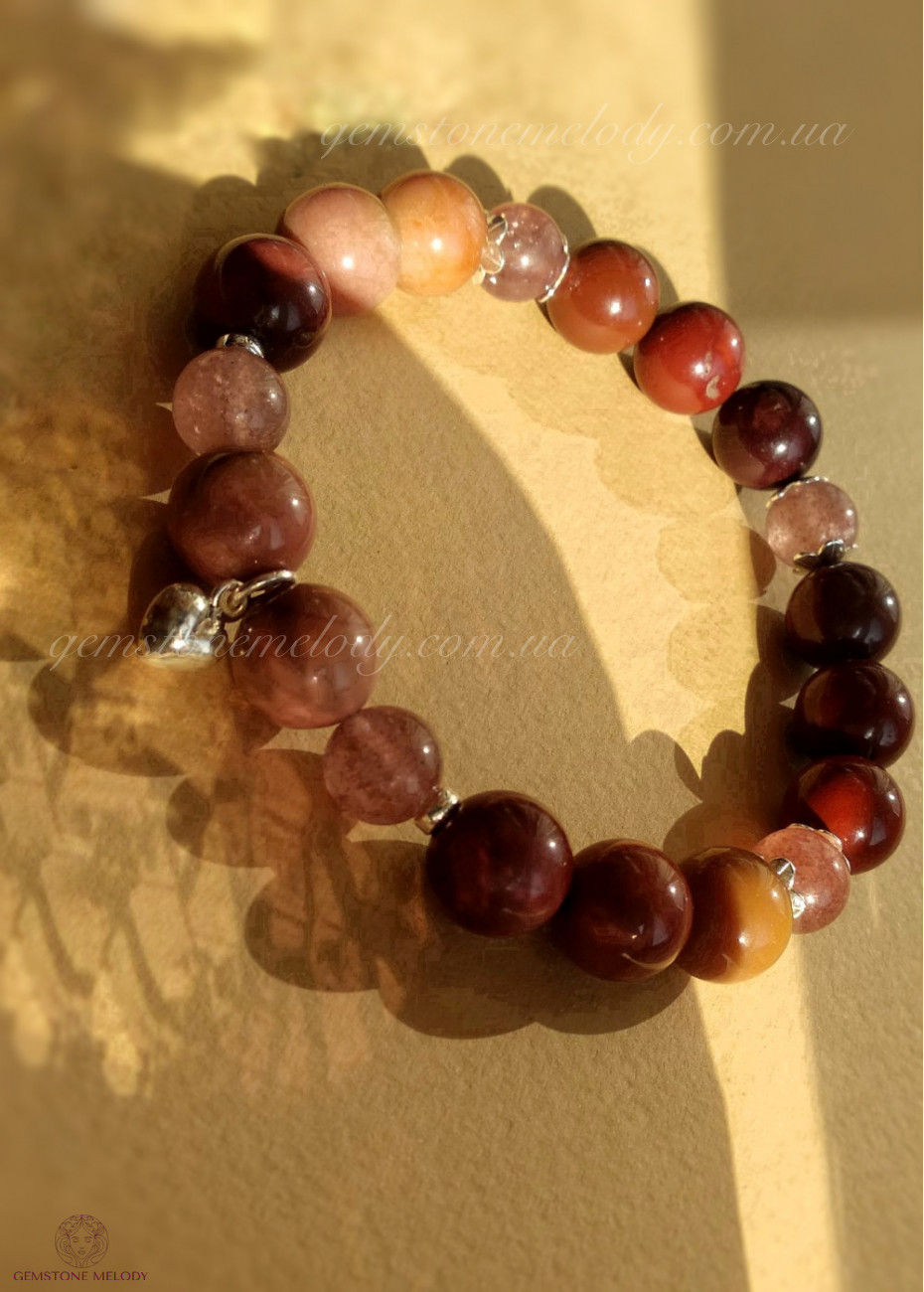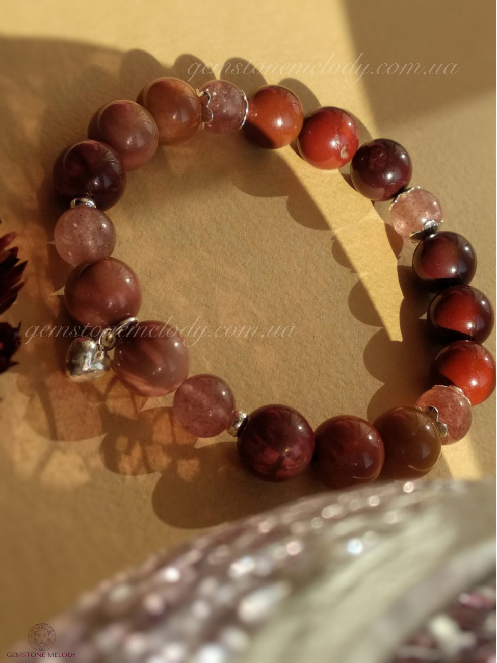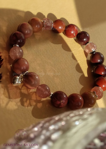 Браслет на резинке, фурнитура серебро 925пробы. Натуральные камни яшма мукаит диаметром 10мм, и клубничный кварц диаметром 8мм.