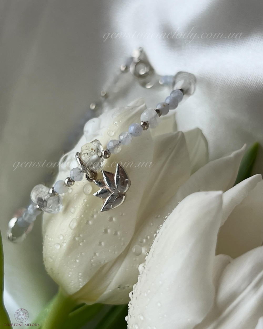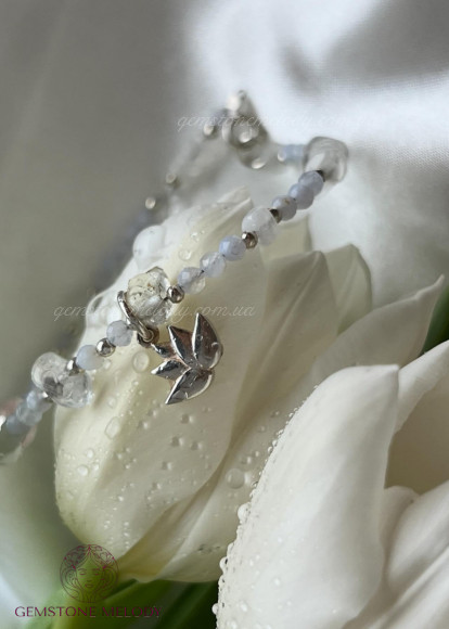 мереживний агат 3мм, місячний камінь 1,5*4,5мм, вставки морганіту, топазу, херкімерського кришталю, срібло 925 проби;