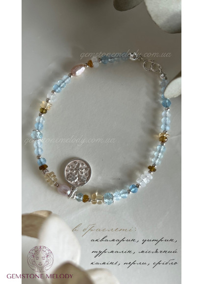 В браслеті: аквамарин 2,5*4мм, топаз, жовті і коричневі турмаліни, перли, місячний камінь, усі камінчики високої якості;срібло 925 проби;