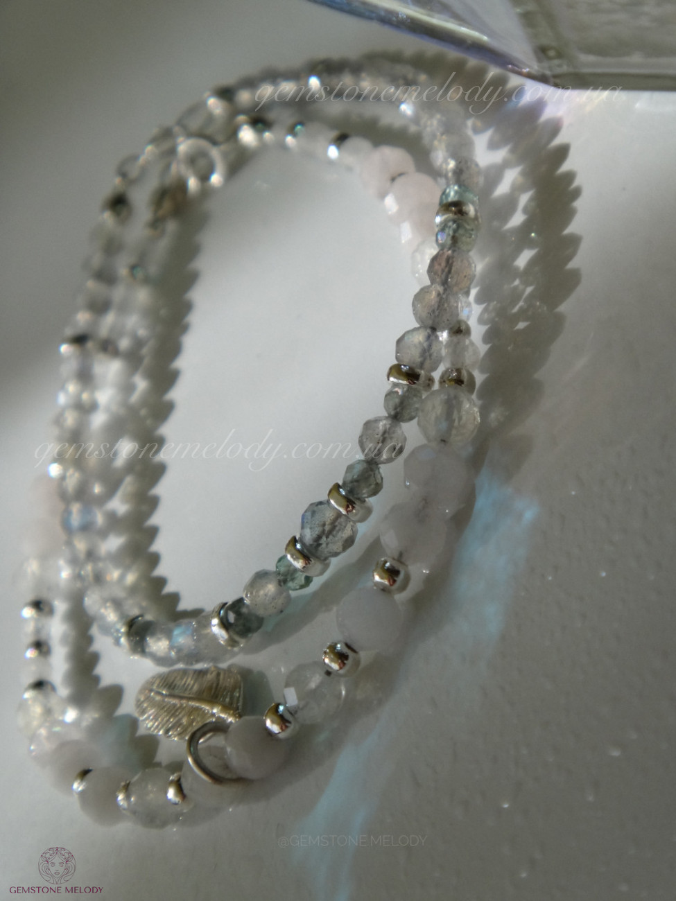Ніжний тонкий браслет з натурального каміння: лабрадор 4мм и 3мм, апатіт 3мм, срібло 925 проби; на замочку, на фото це-верхній браслет