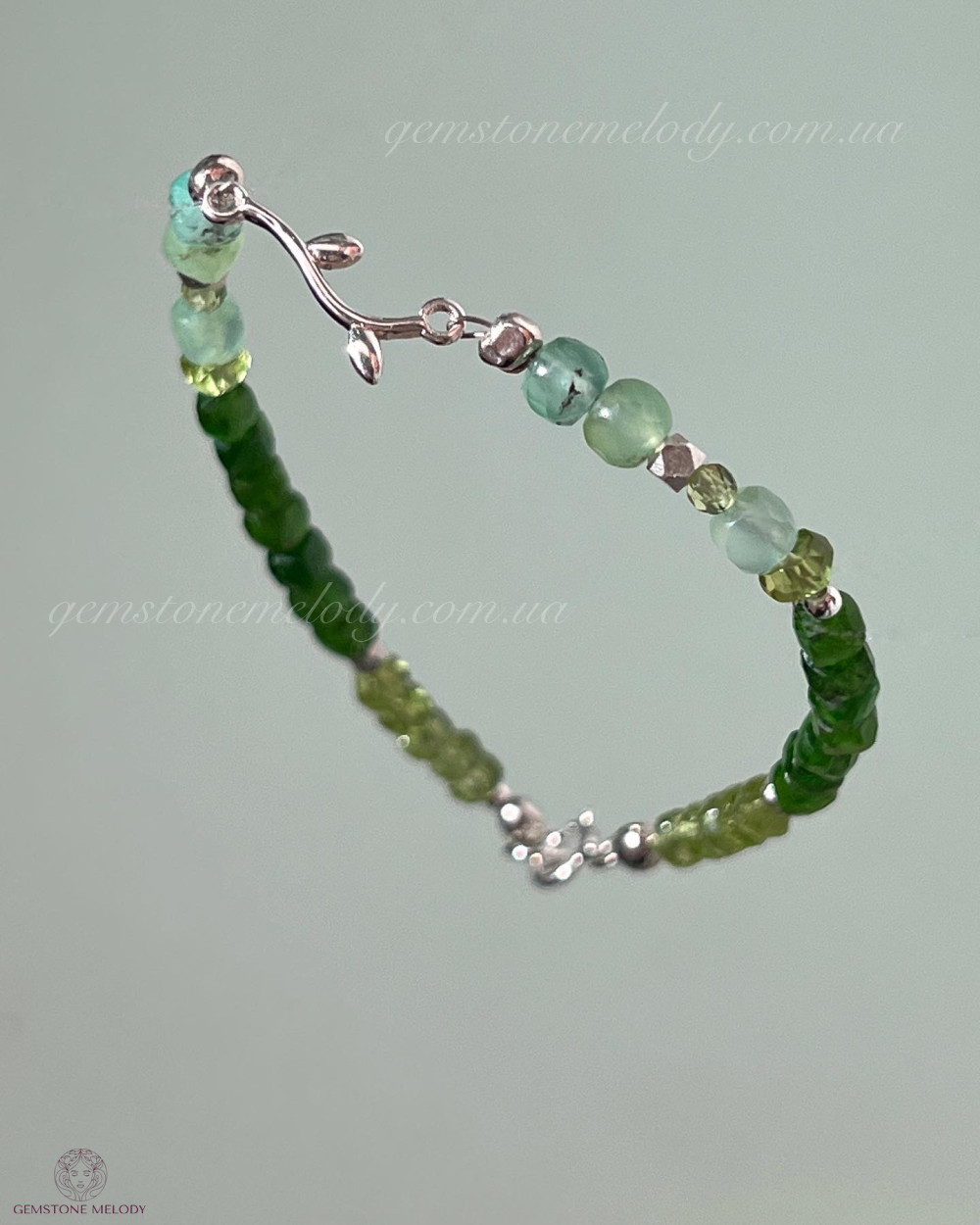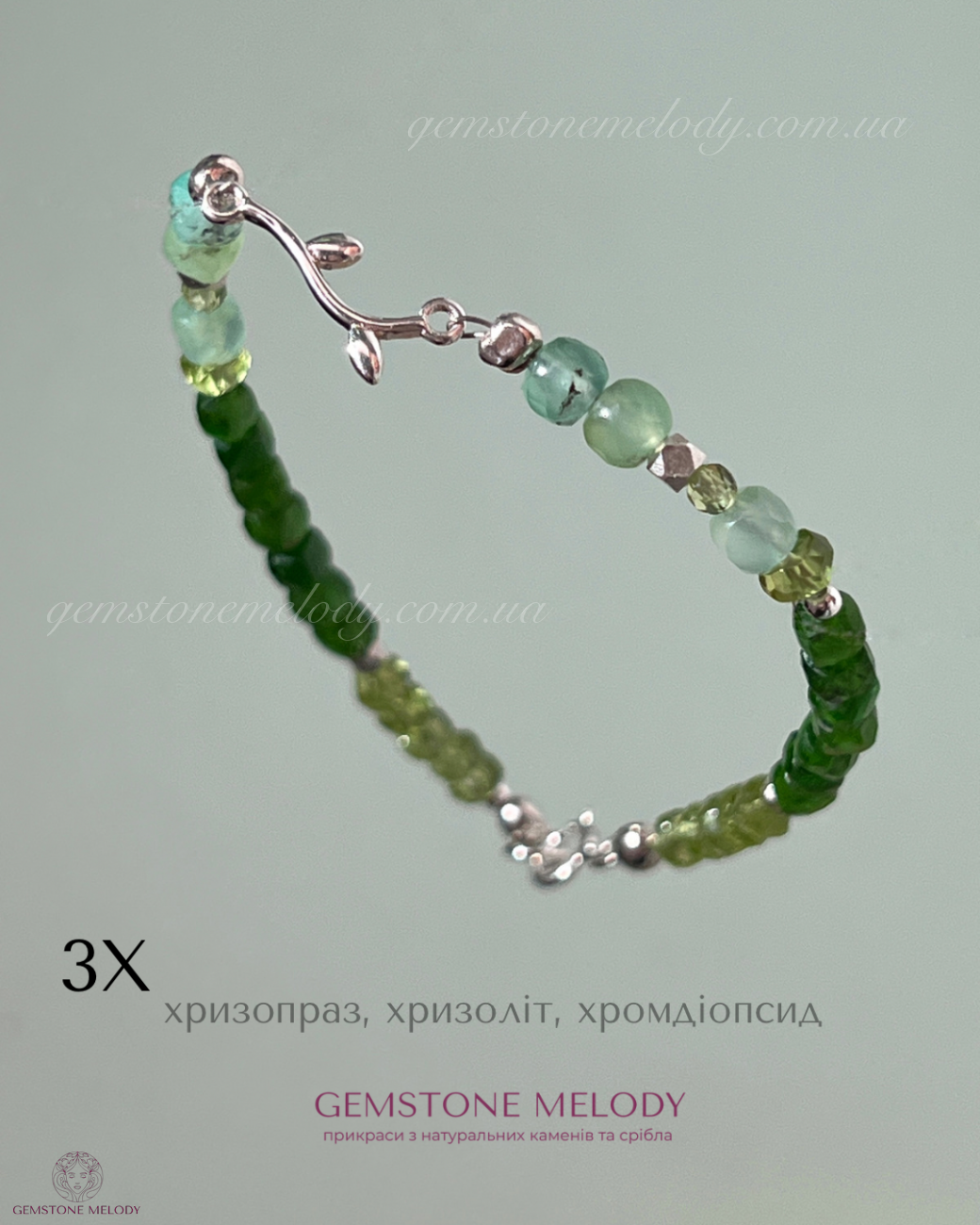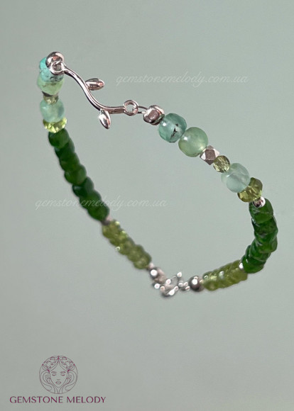 В браслеті: хризопраз 4*4мм, хризоліт, хромдіопсид 3,5*3,5мм; фурнітура срібло 925 проби; на замочку;