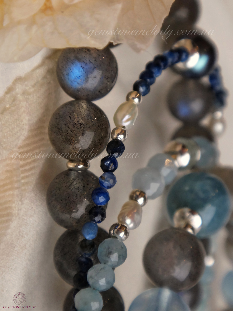 У тонкому браслеті: кіаніт 2мм, перлини двох розмірів, фурнітура срібло 925 проби. Браслет на замочку