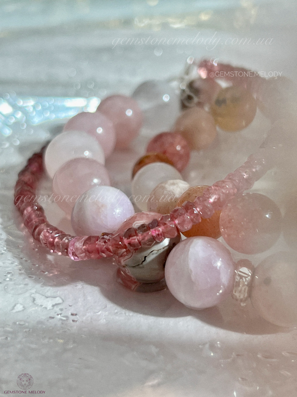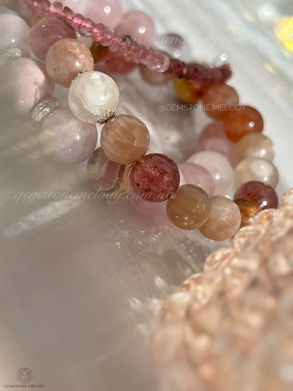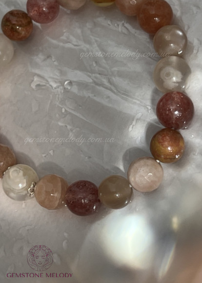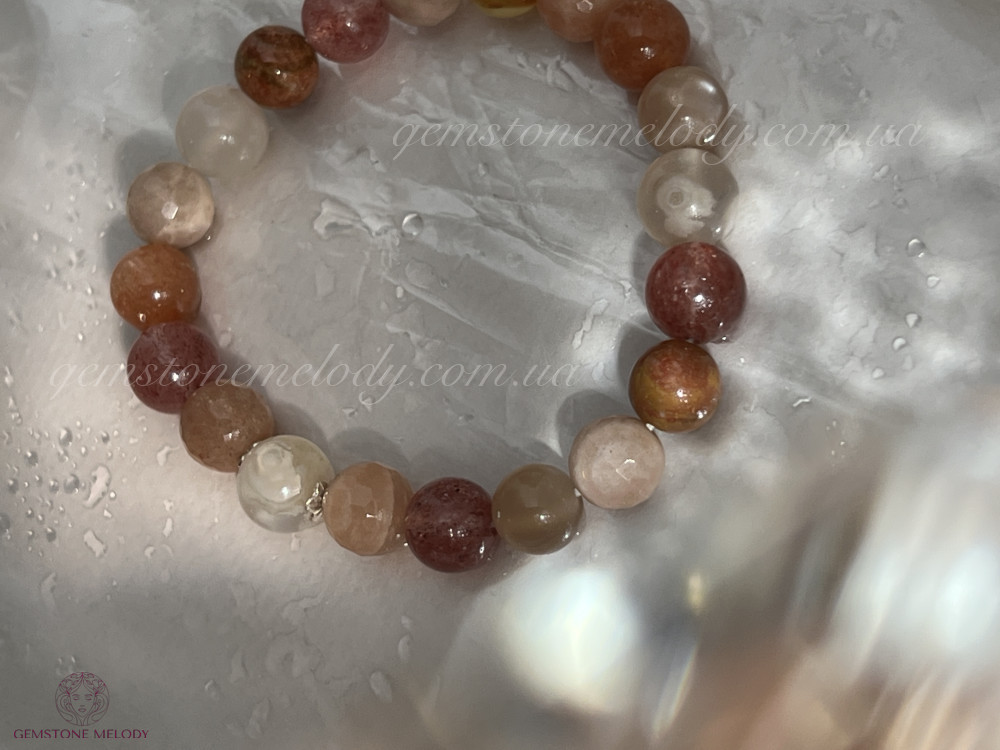 квітковий агат 9мм, полуничний кварц високої якості 8мм, яшма, сонячний кварц двох форм 8,5мм; фурнітура срібло 925 проби;