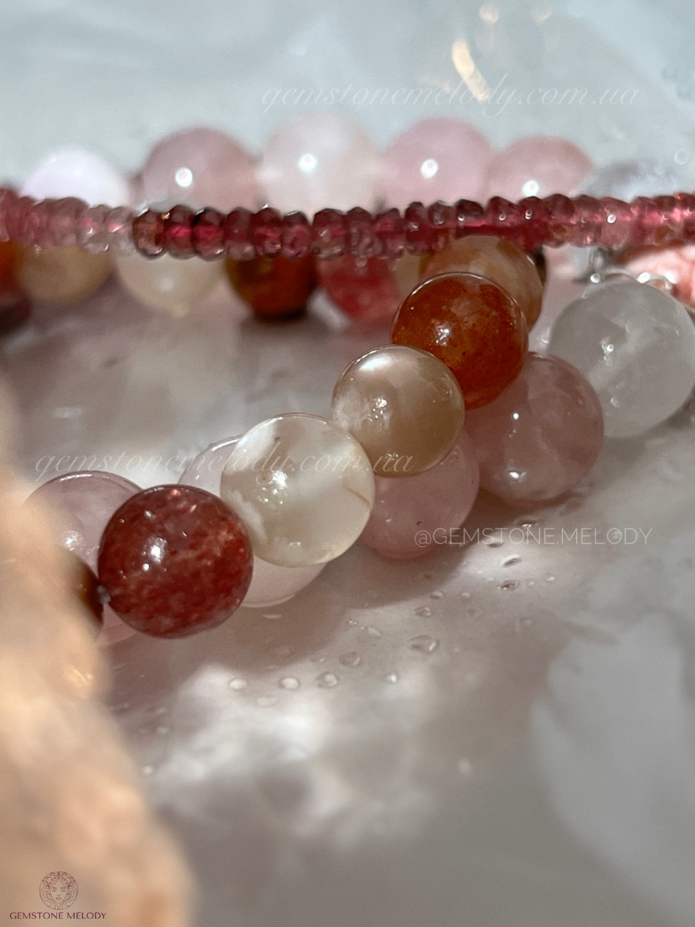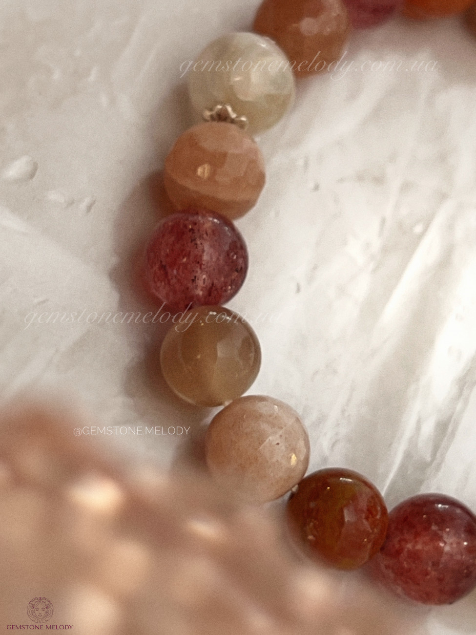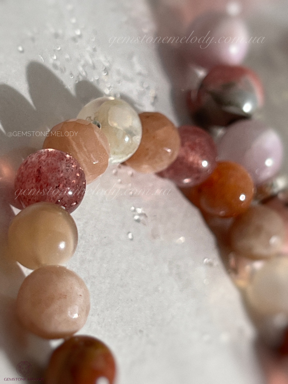 Браслет з квіткового Агату, полуничного кварцу, сонячного каменя двох видів, яшми
