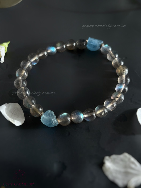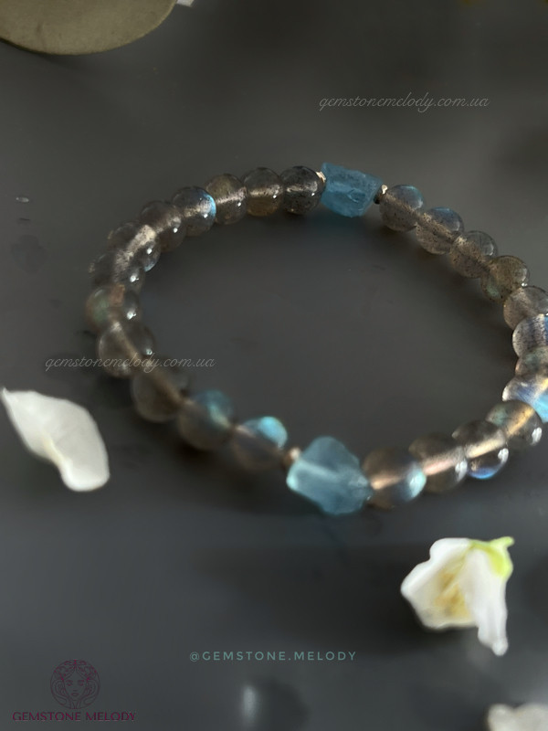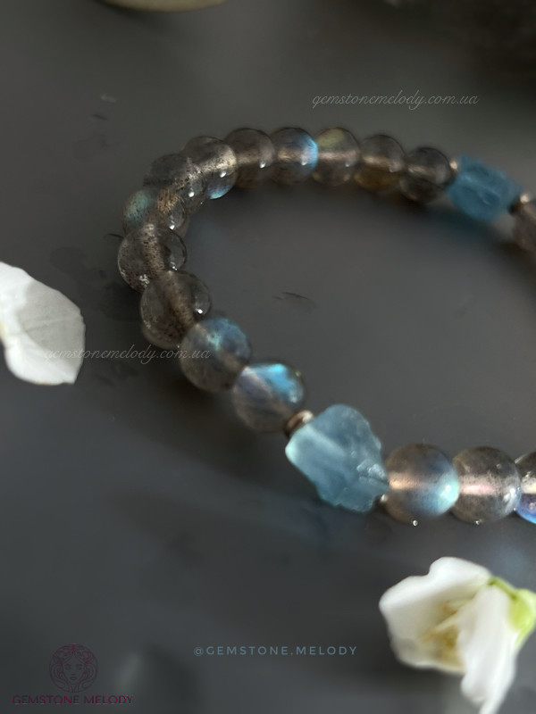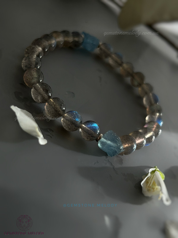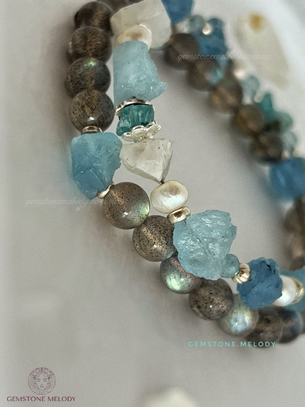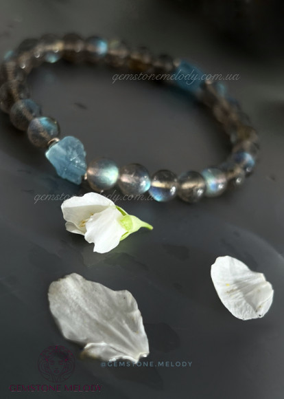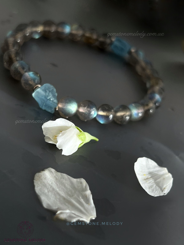 Цей браслет не залише Вас байдужим до світу натуральних каменів. Бо камінь лабрадор високої якості має неперевершену ірізацію в кожному камінці. А аквамарин необробленої форми розкриє усю натуральність природи,чистоту, і досконалість в недосконалості.