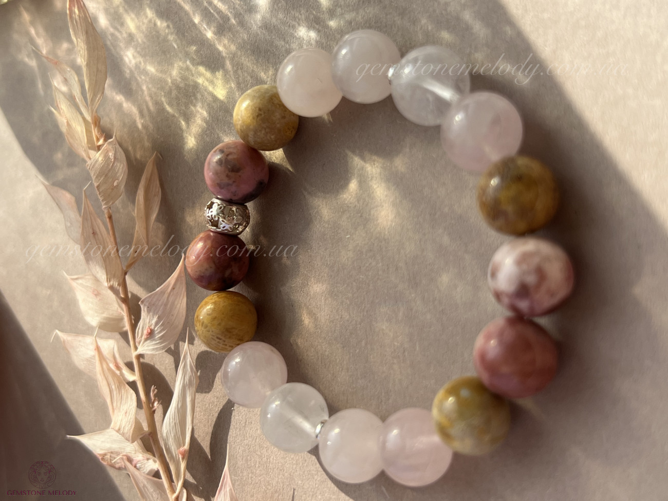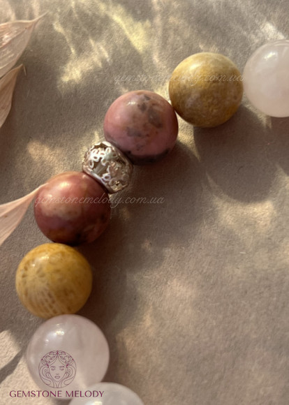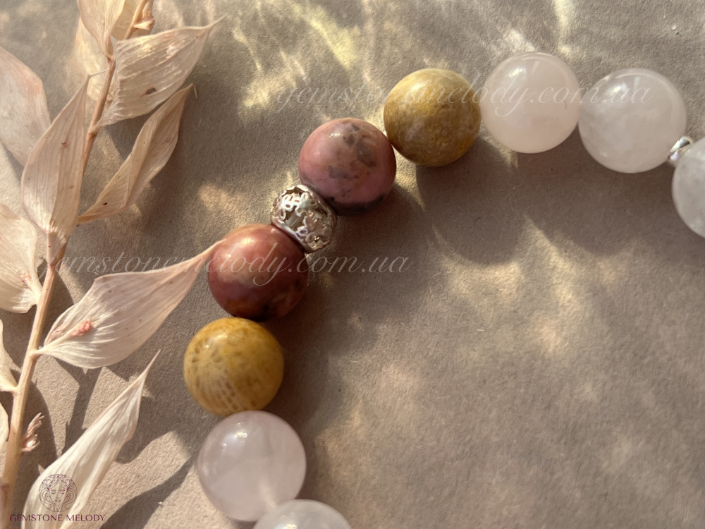 родоніт 10мм, рожевий кварц 10мм, кварц10мм, закам‘янілий корал 10мм; срібло 925 проби; на резинці