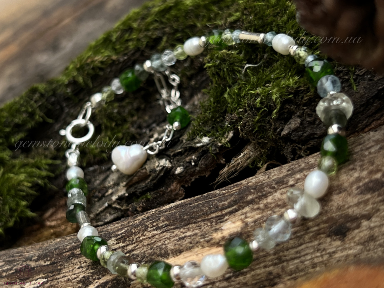 хромдіопсид високої якості 4*4мм, перли 3*4мм, аквамарин високої якості; хризоліт 2,5мм; апатит 1мм; берил високої якості 4*6мм; місячний камінь 3мм; турмалін високої якості 2.5*4мм; на замочку