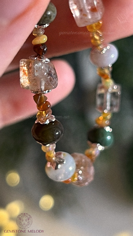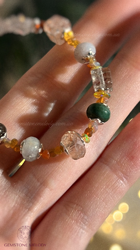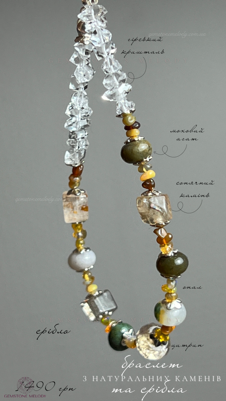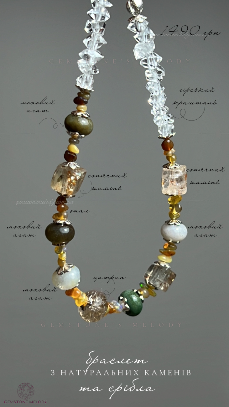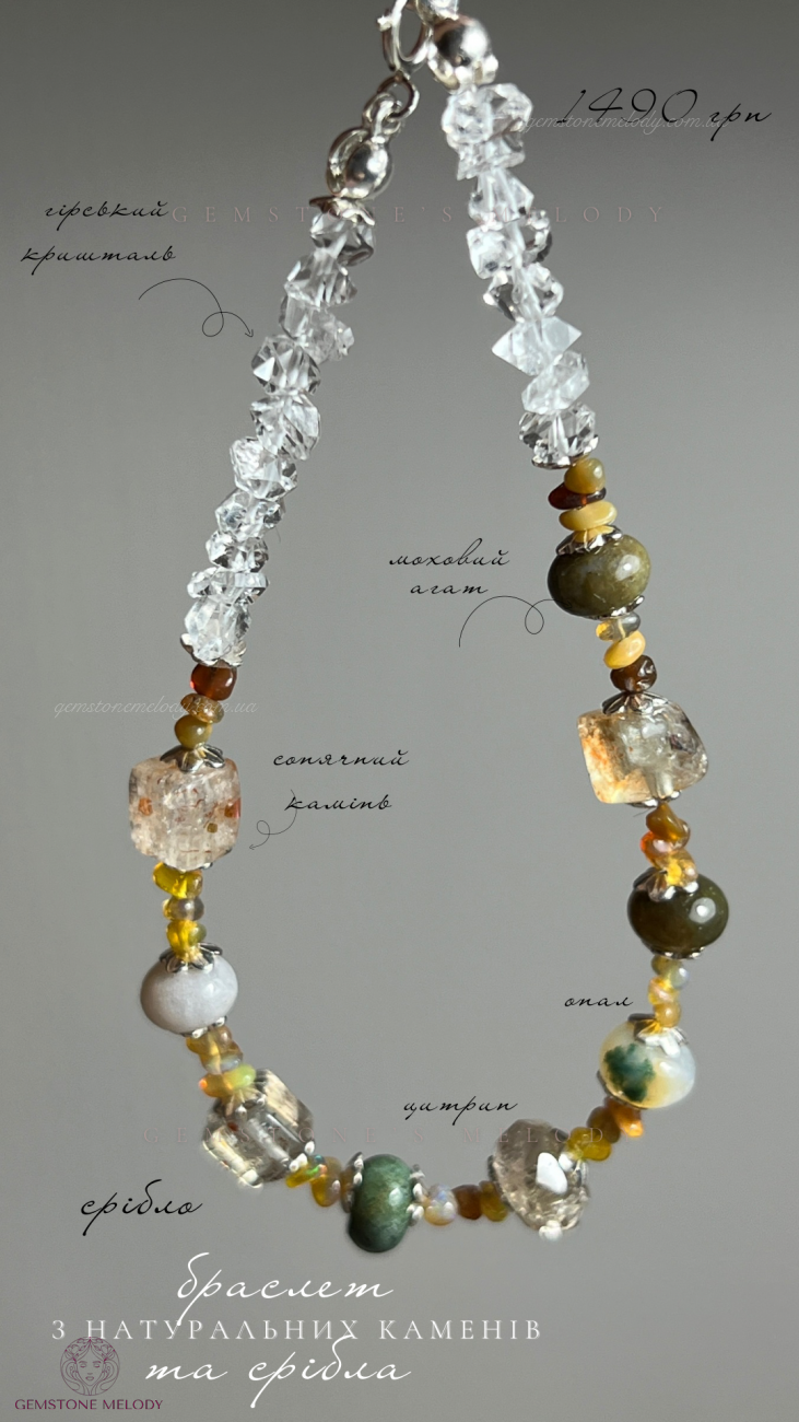 гірський кришталь 4*5мм; моховий агат, цитрин 4*6мм; благородний опал 1,5*3мм; на замочку; сонячний камінь високої якості куб 5мм; срібло 925 проби; на замочку; 1490 грн