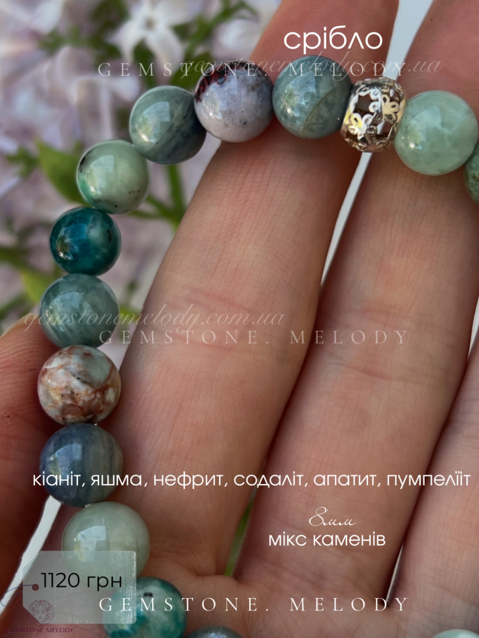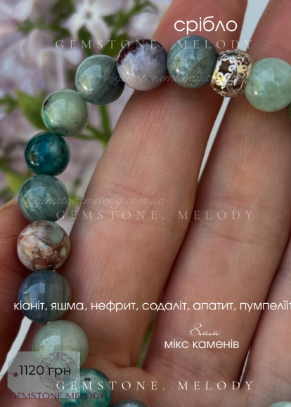 блакитний кіаніт 8мм, яшма 8мм, содаліт(гакманіт) 8мм, пумпелііт 8,5мм, синій кіаніт 8мм, нефрит 8мм; апатит 8,5мм, опал 8,5мм;