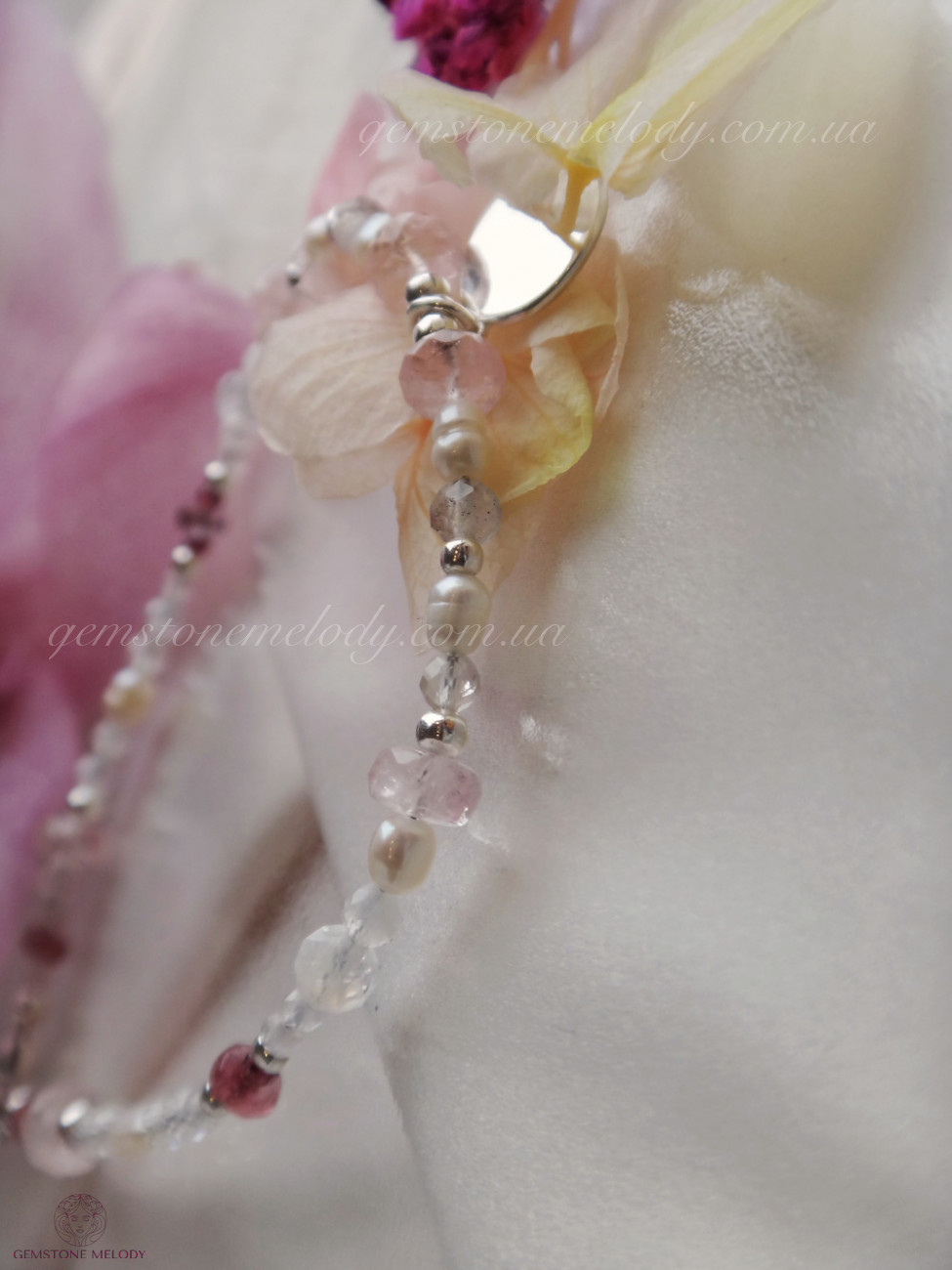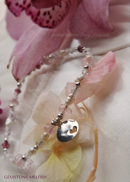 турмалін 2×4мм, турмалін 4×3мм, гранат 2 и 3.5мм, морганіт високої якості (берилл)3×5мм, топаз 3мм, перли, місячний камінь, срібло 925проби;