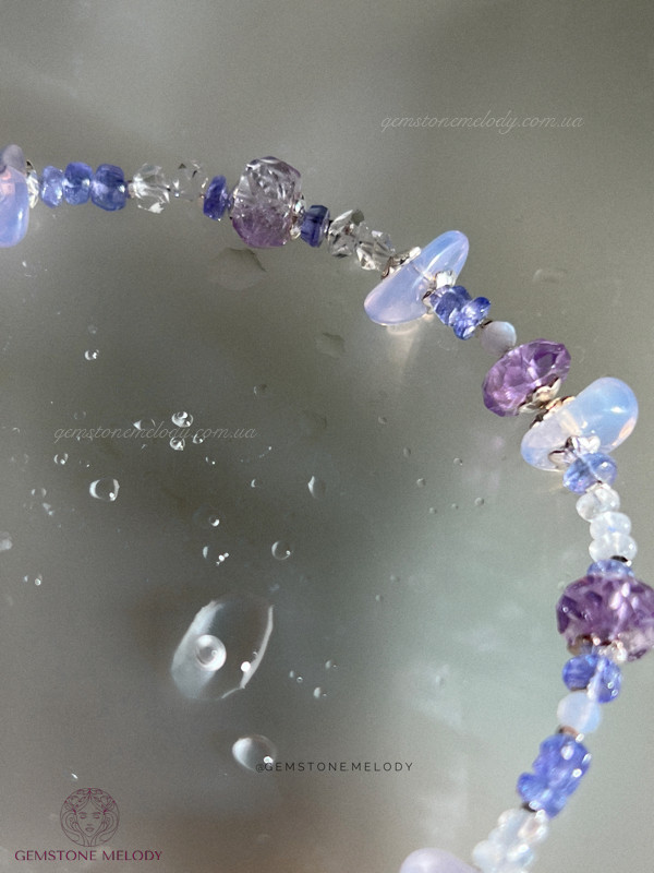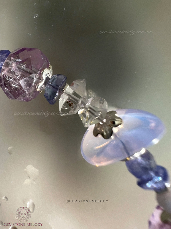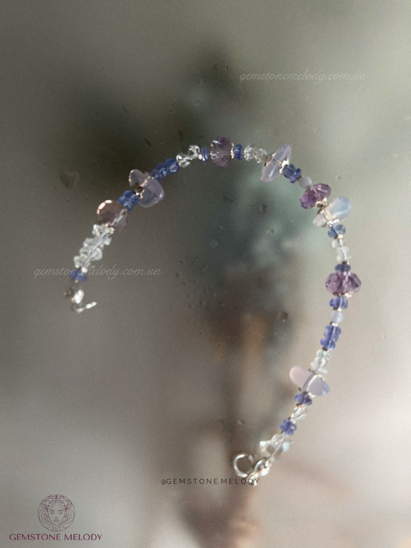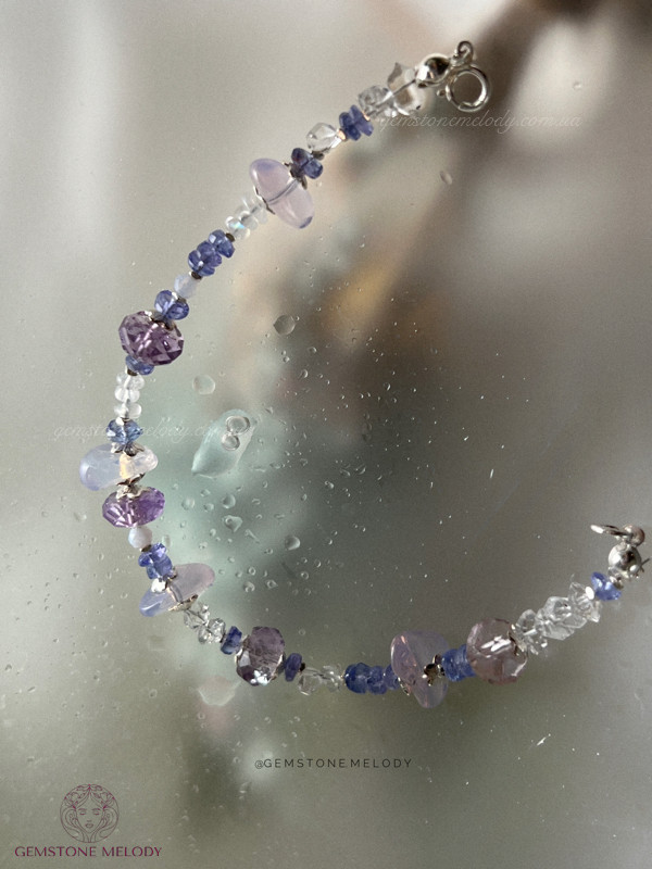 В браслеті: танзаніт високої якості (прозорий) 2*5мм, 2,5*4,5мм, лавандовий кварц 4*9мм, херкімерський діамант (кришталь) 2*4мм, аметист 4,5*8мм, місячний камінь 4-*2,5мм, мережевий блакитний агат 1мм; срібло 925 проби; на замочку; 2100 грн
