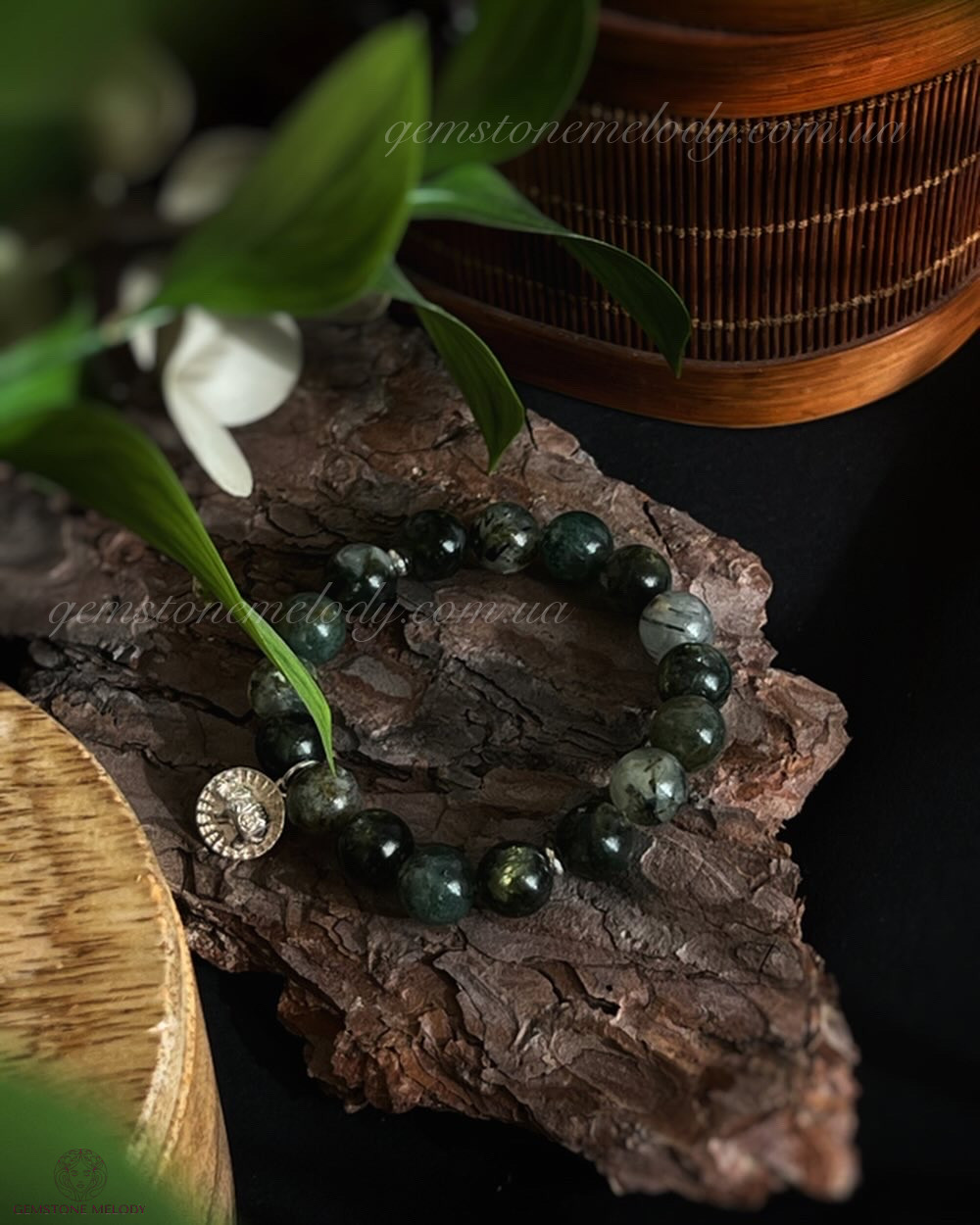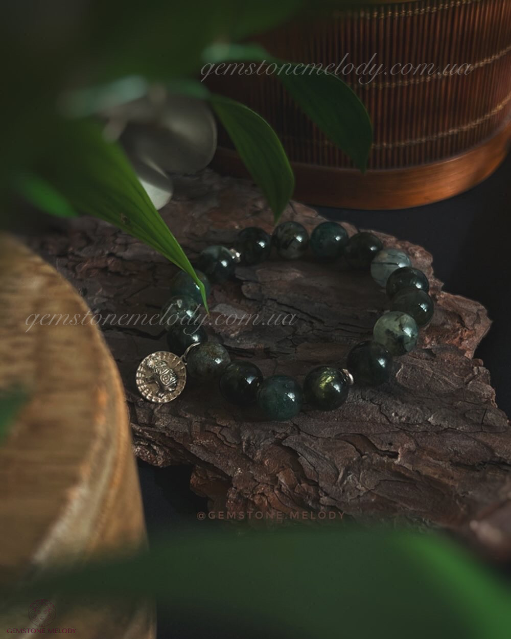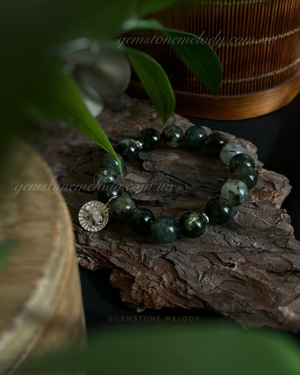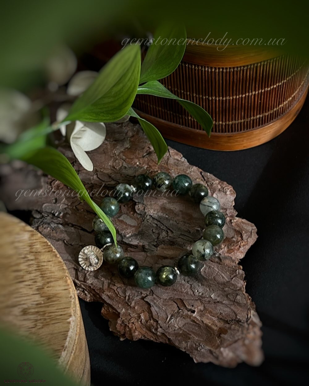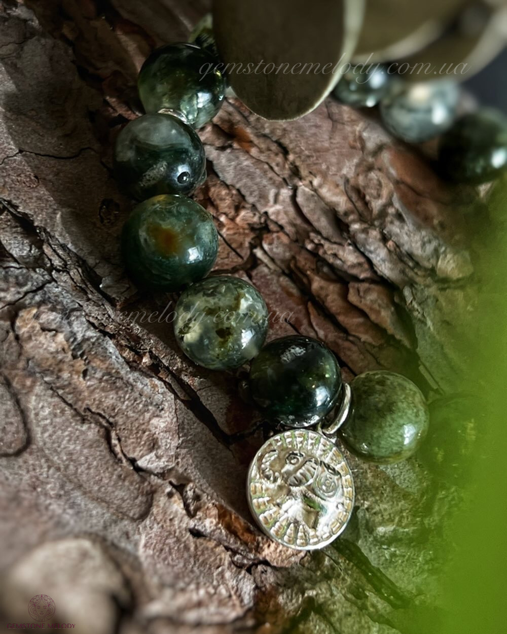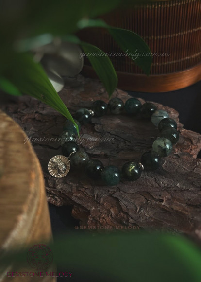 В браслеті: лепідоліт зелений високої якості і рідкісний колір 10мм, моховий агат(халцедон) 10мм, преніт 10мм; срібло 925 проби;