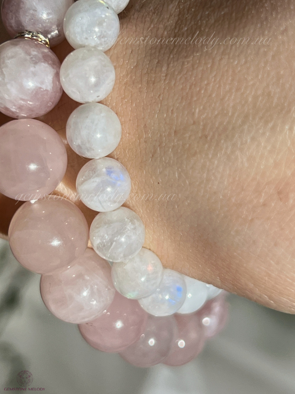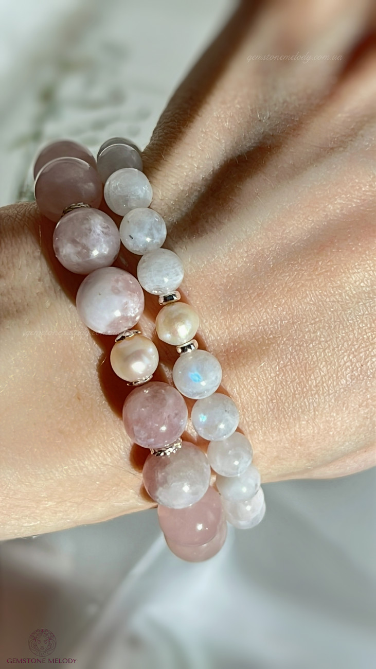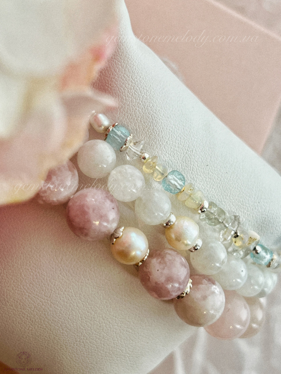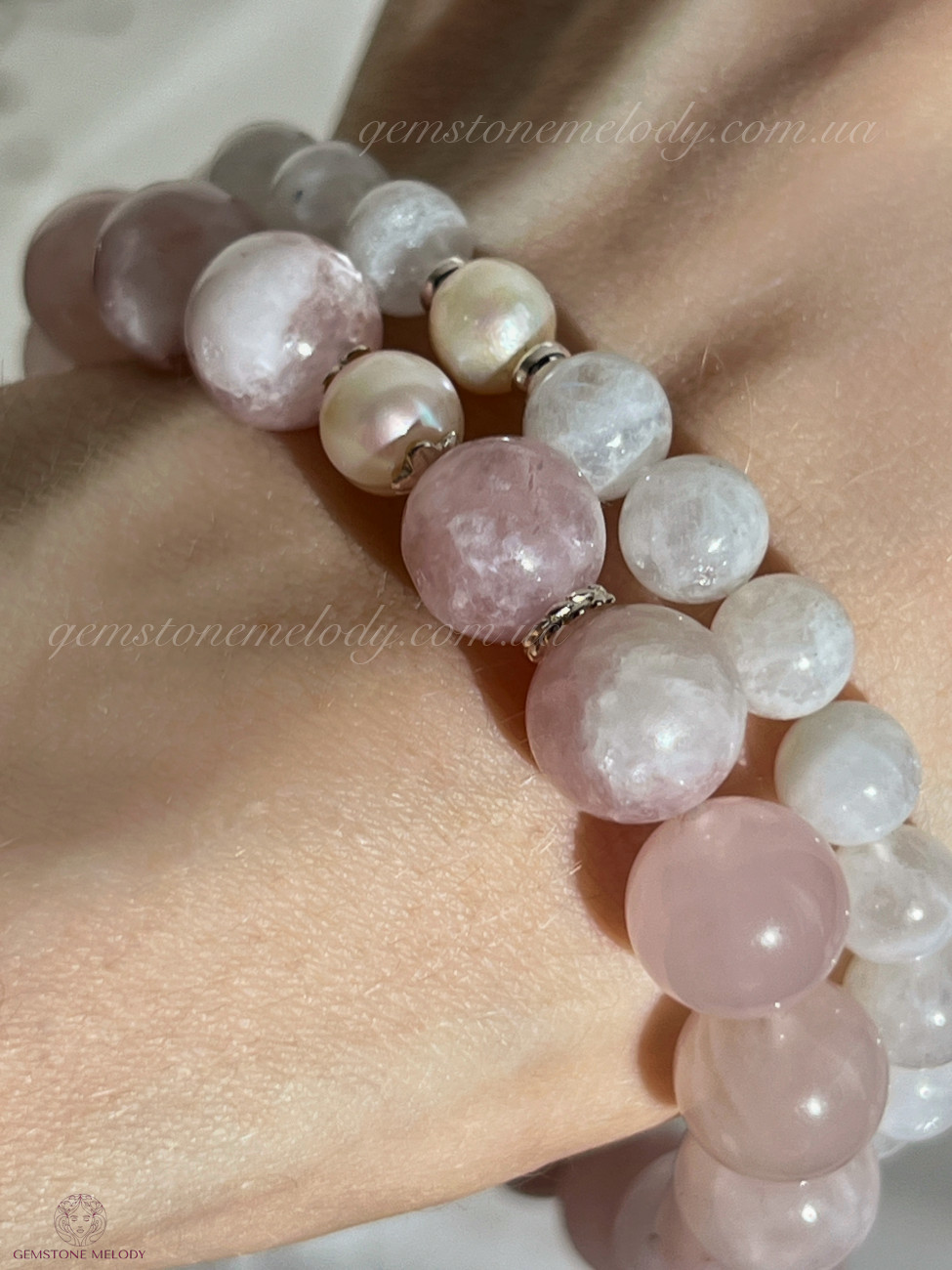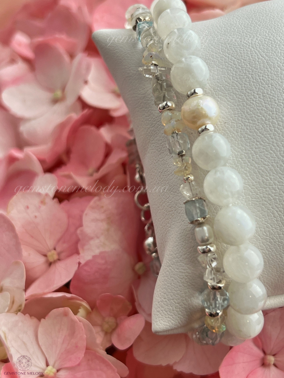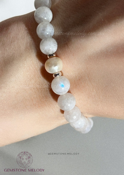 В браслеті: місячний камінь 8мм; вставка перлини; фурнітура срібло 925 проби; на резинці; 850 грн