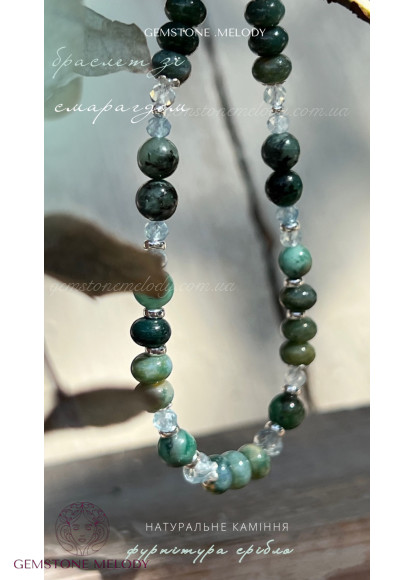 В браслеті: моховий агат; смарагд 6мм, топаз 5*3мм; гранений аквамарин високої якості 3*4мм; фурнітура срібло 925 проби;