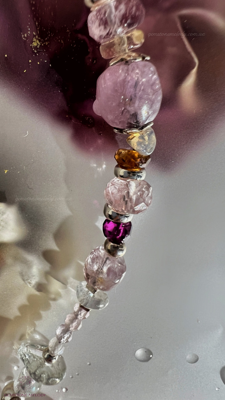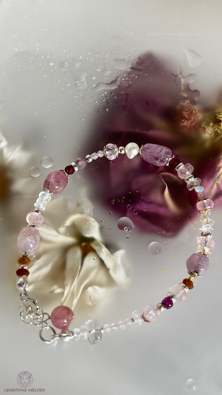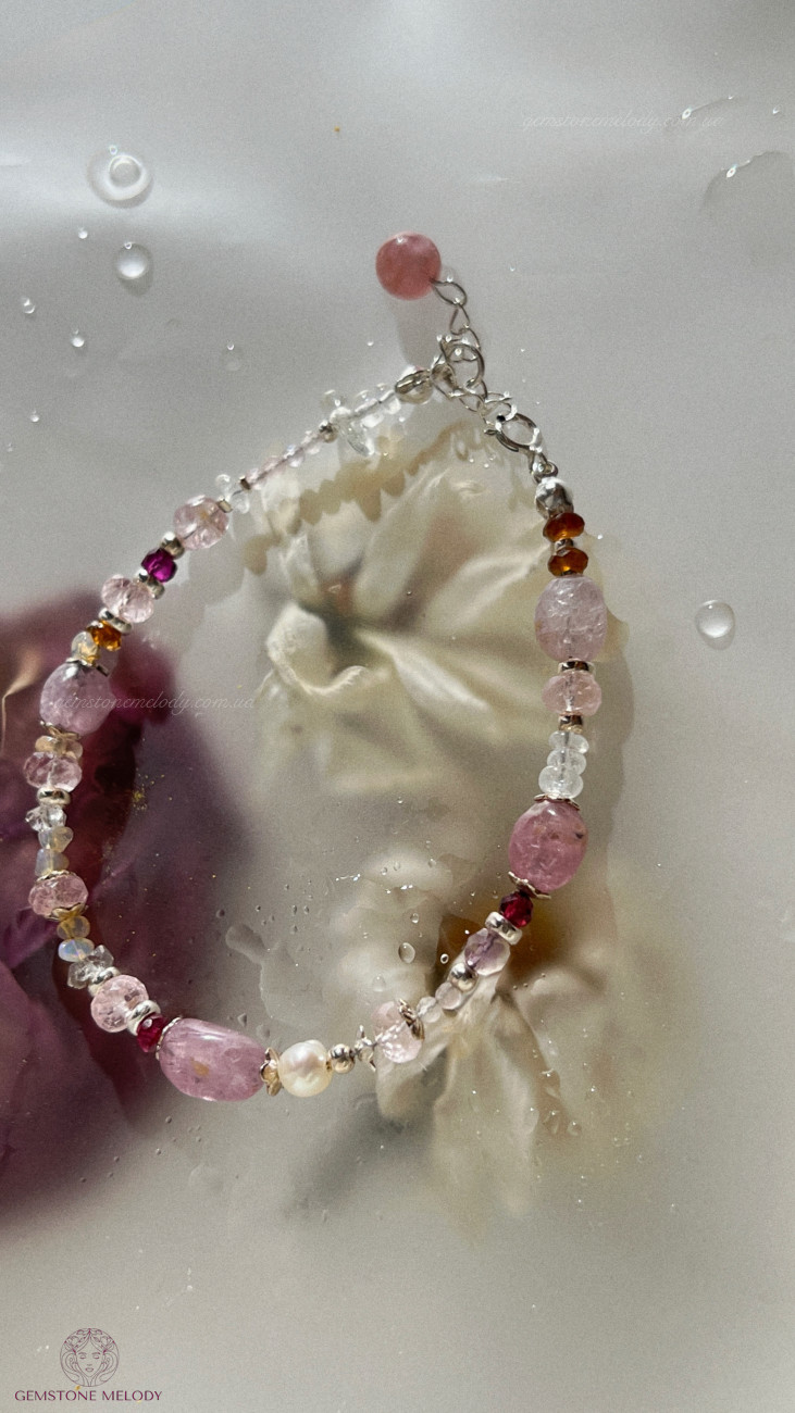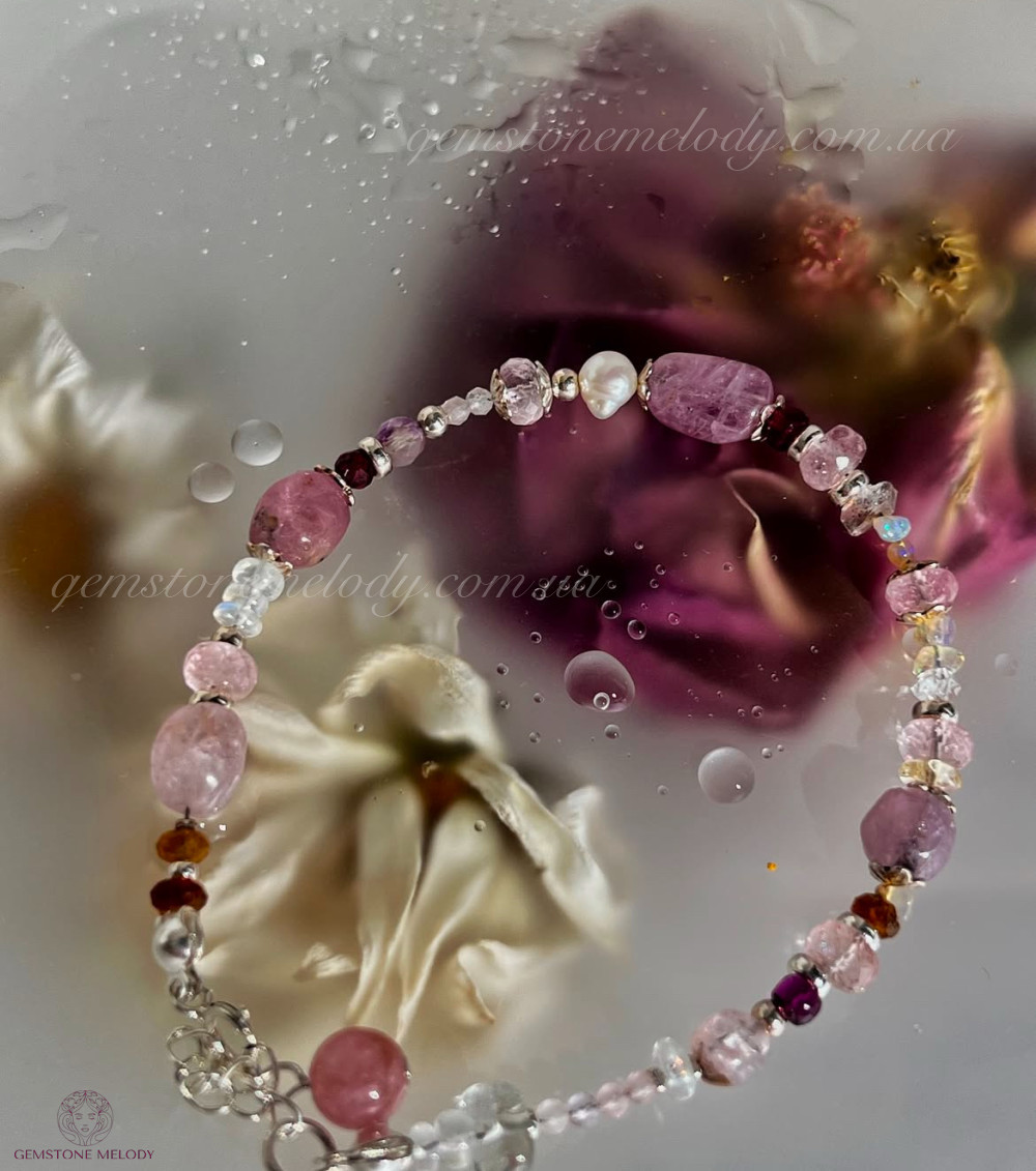 В браслеті: місячний камінь високої якості 4*5,5мм; турмаліни малиновий і пісочні; веселкові опали, шпінель 5*6,5мм; морганіт високої якості ;кунцит 2мм, топаз, перли; гранат; херкімерський діамант; на подовжувачі турмалін (рубелліт); фурнітура срібло 925 проби; 1730 грн