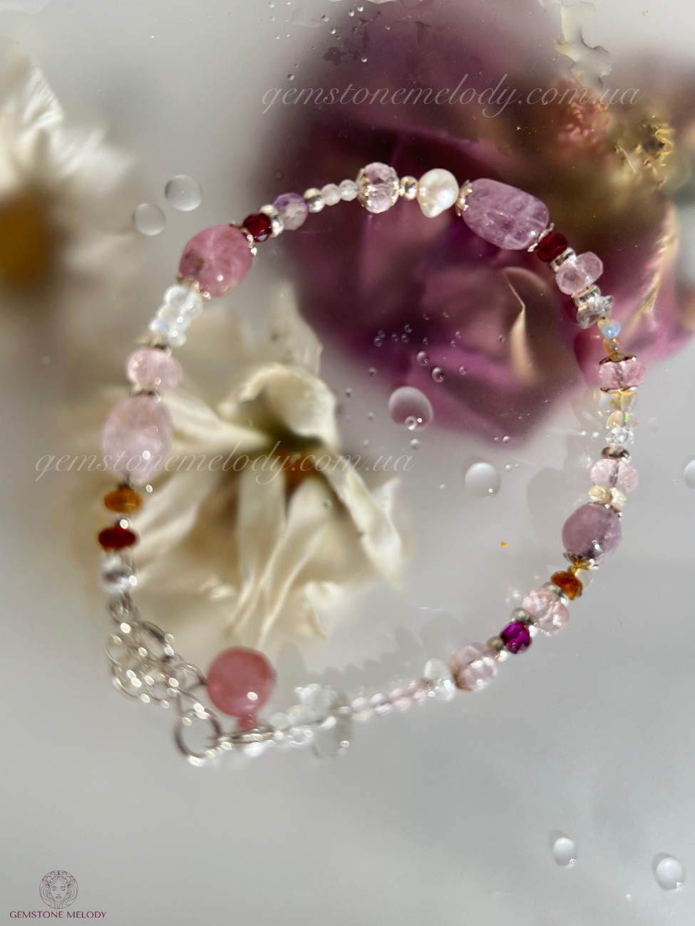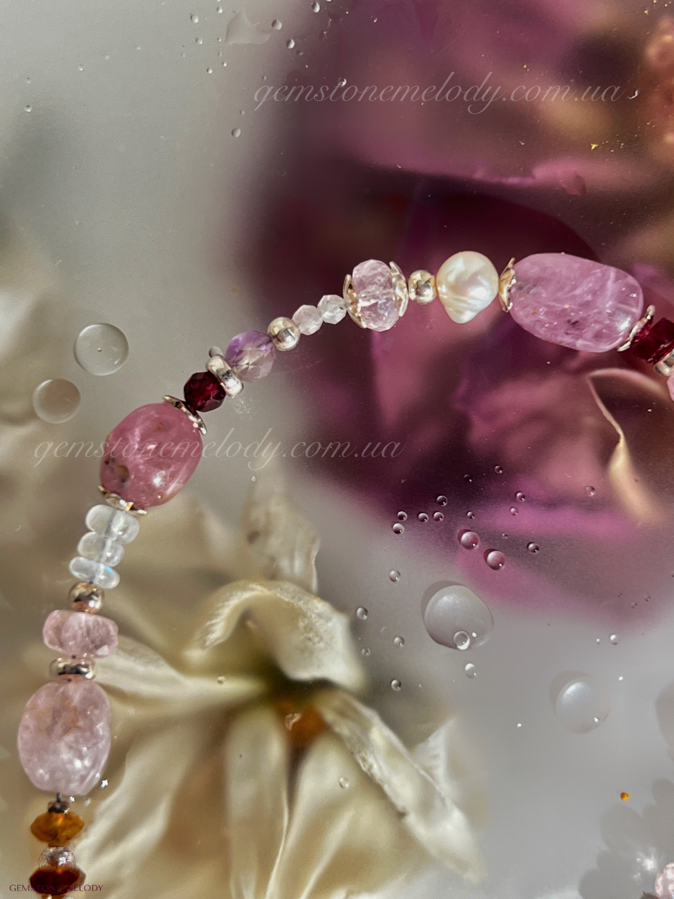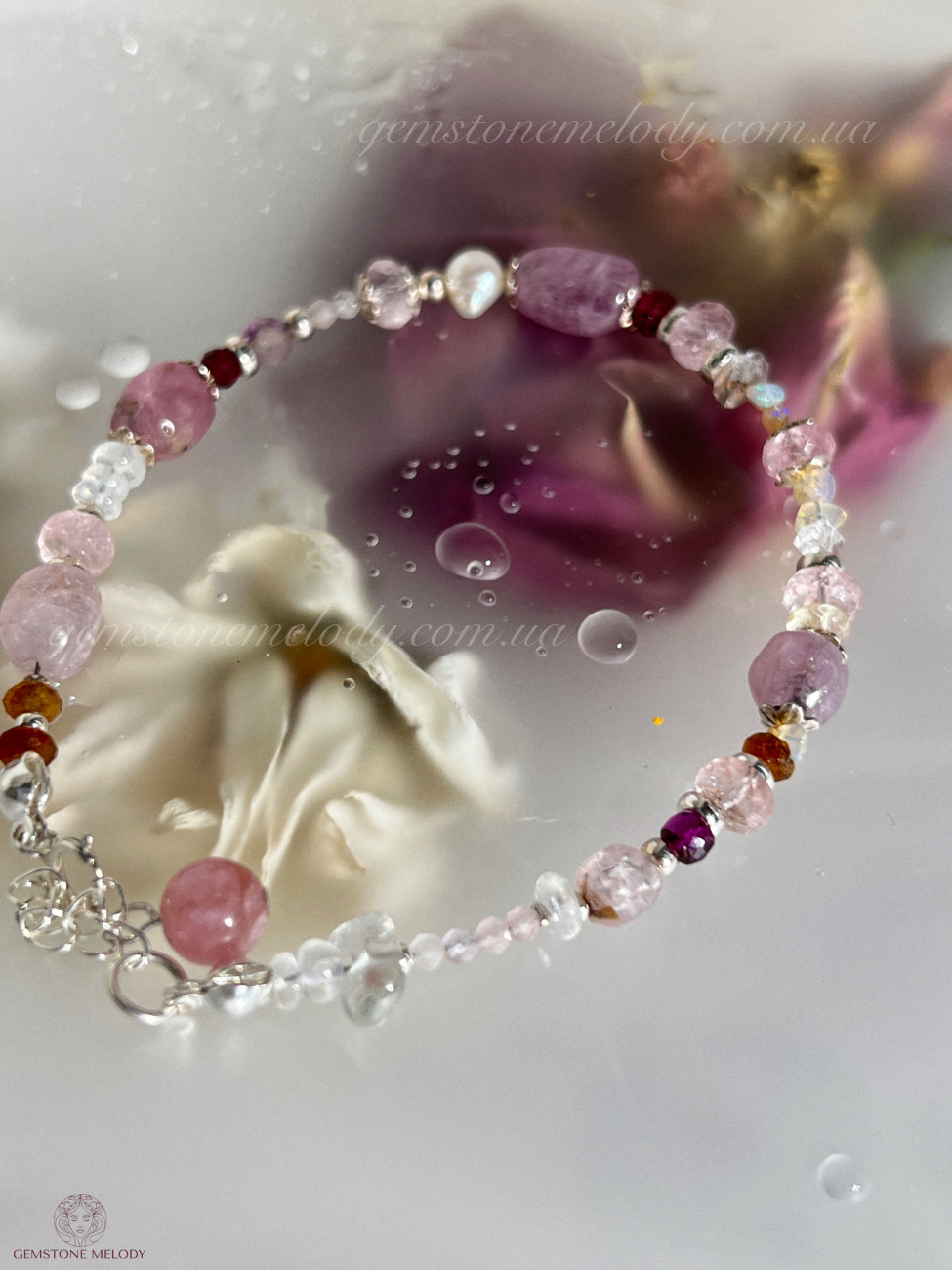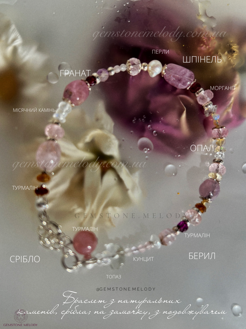В браслеті: місячний камінь високої якості 4*5,5мм; турмаліни малиновий і пісочні; веселкові опали, шпінель 5*6,5мм; морганіт високої якості ;кунцит 2мм, топаз, перли; гранат; херкімерський діамант; на подовжувачі турмалін (рубелліт); фурнітура срібло 925 проби; 1730 грн