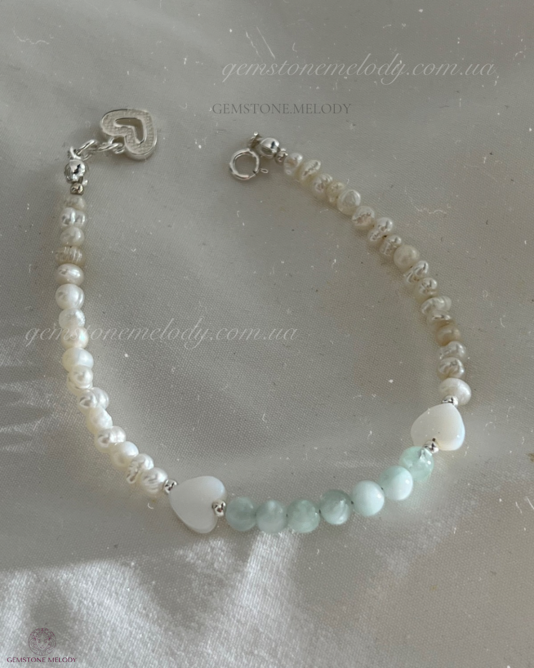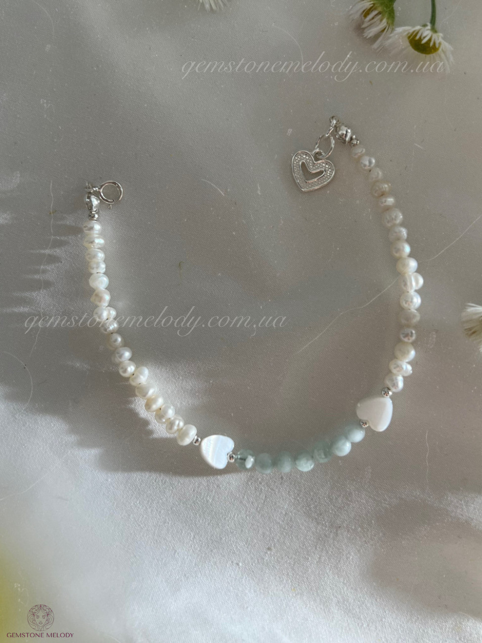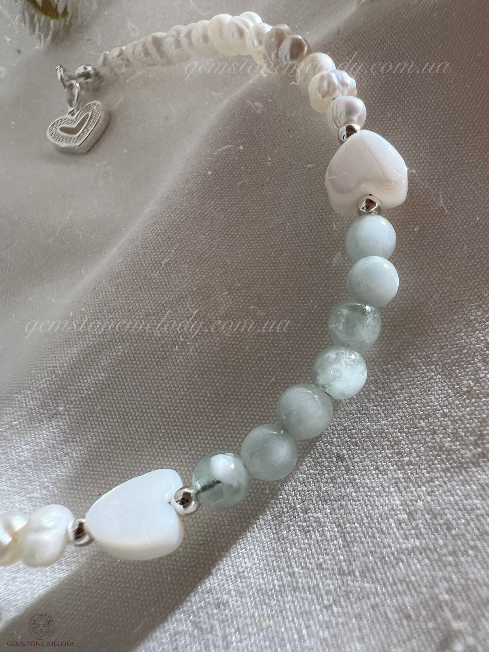 В браслеті : пумпеліїт 4мм, серця з перламутру 6-*4мм, перлини 3*4мм; на замочку; фурнітура срібло 925 проби;