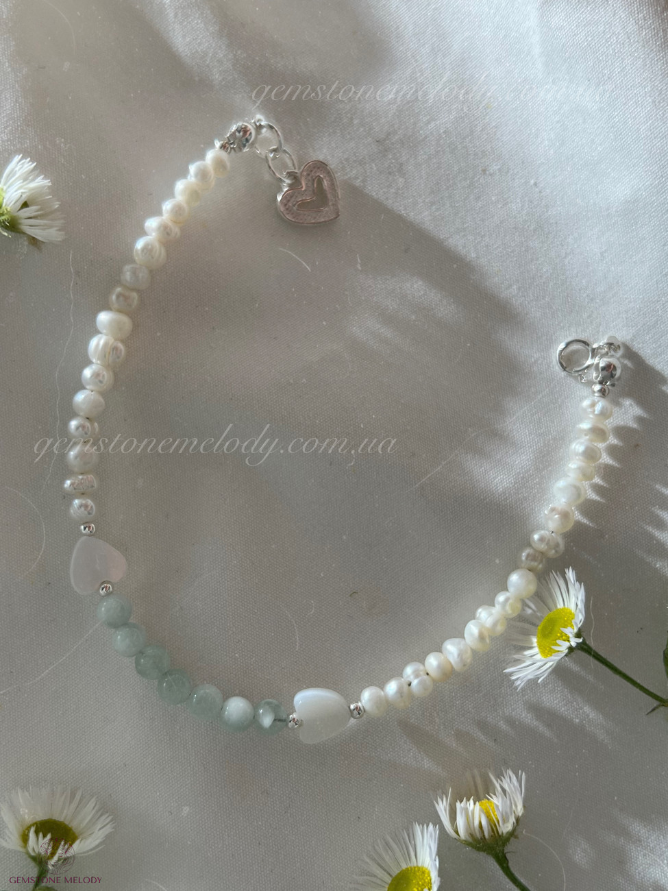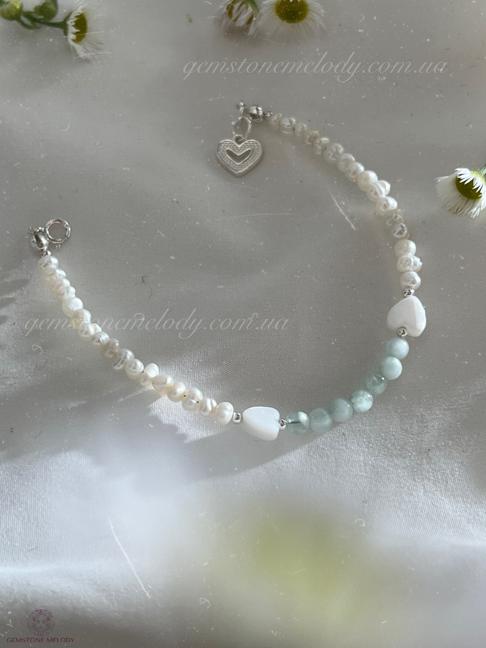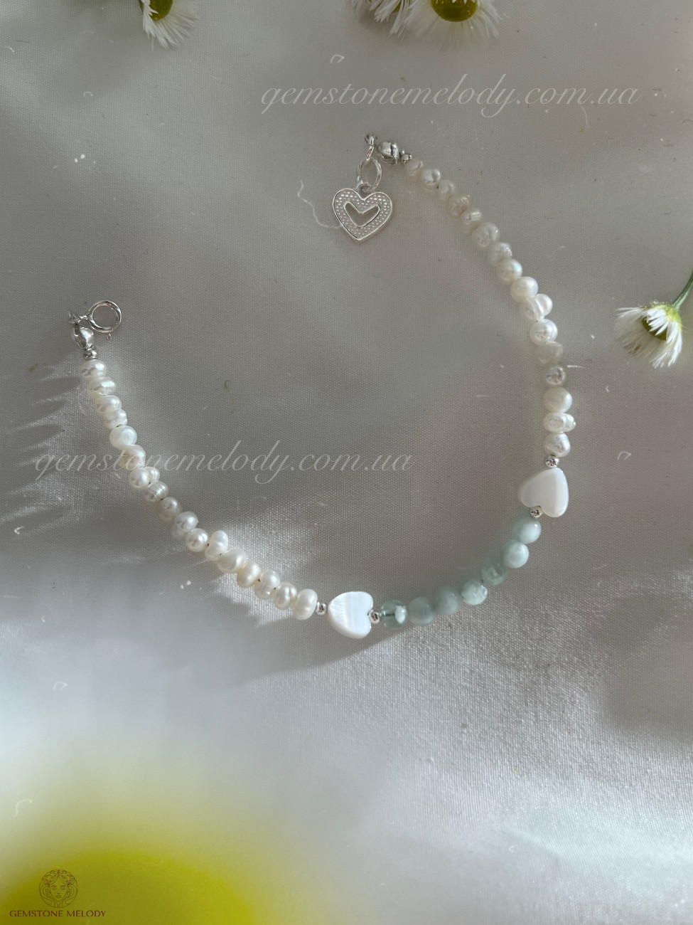 В браслеті : пумпеліїт 4мм, серця з перламутру 6-*4мм, перлини 3*4мм; на замочку; фурнітура срібло 925 проби;