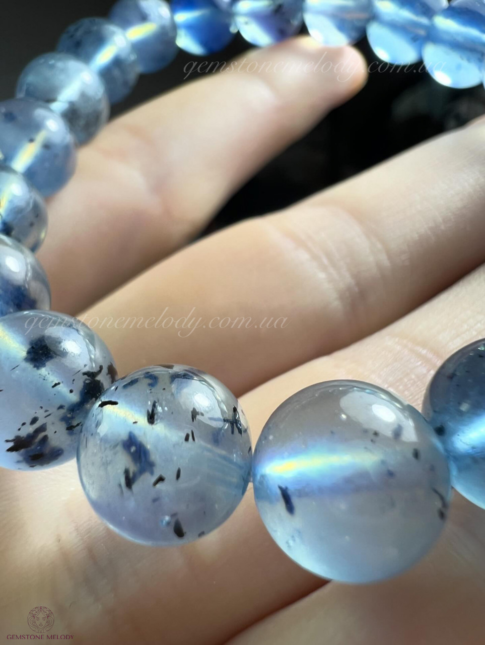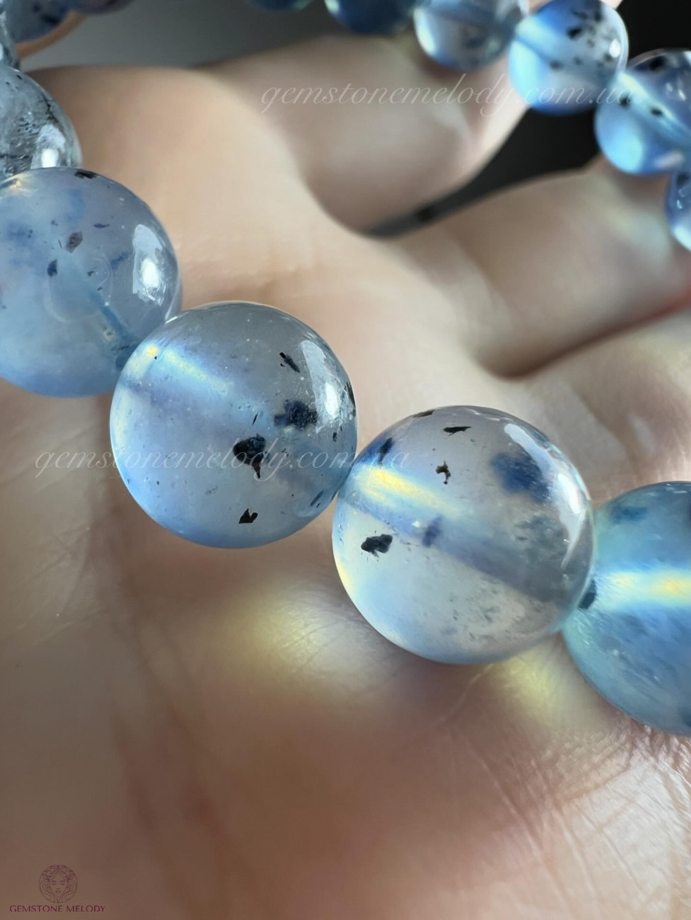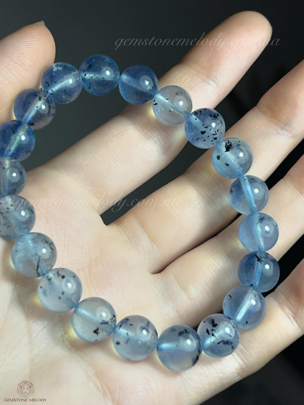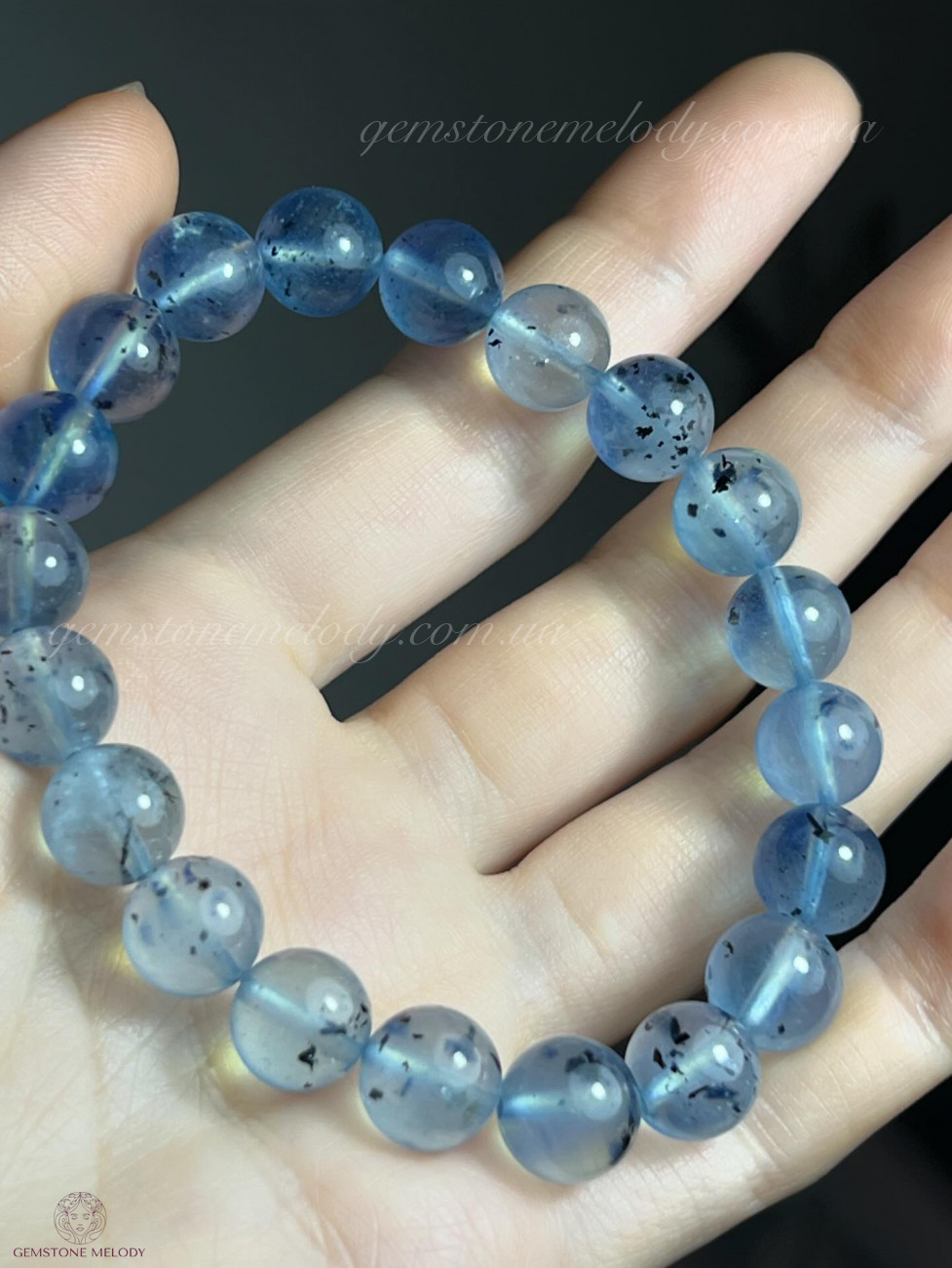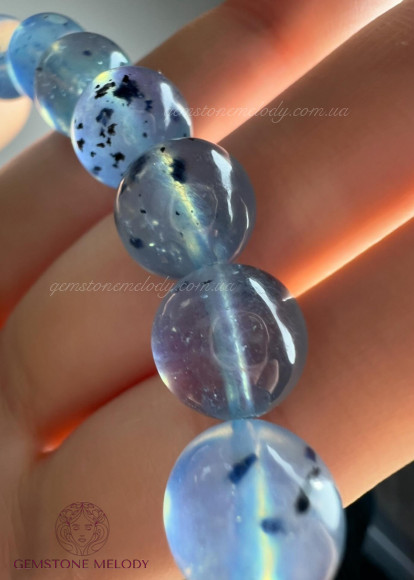 Браслет з натурального аквамарину,який, має має природні включення шерла. Розмір 9-10мм намистин.