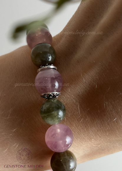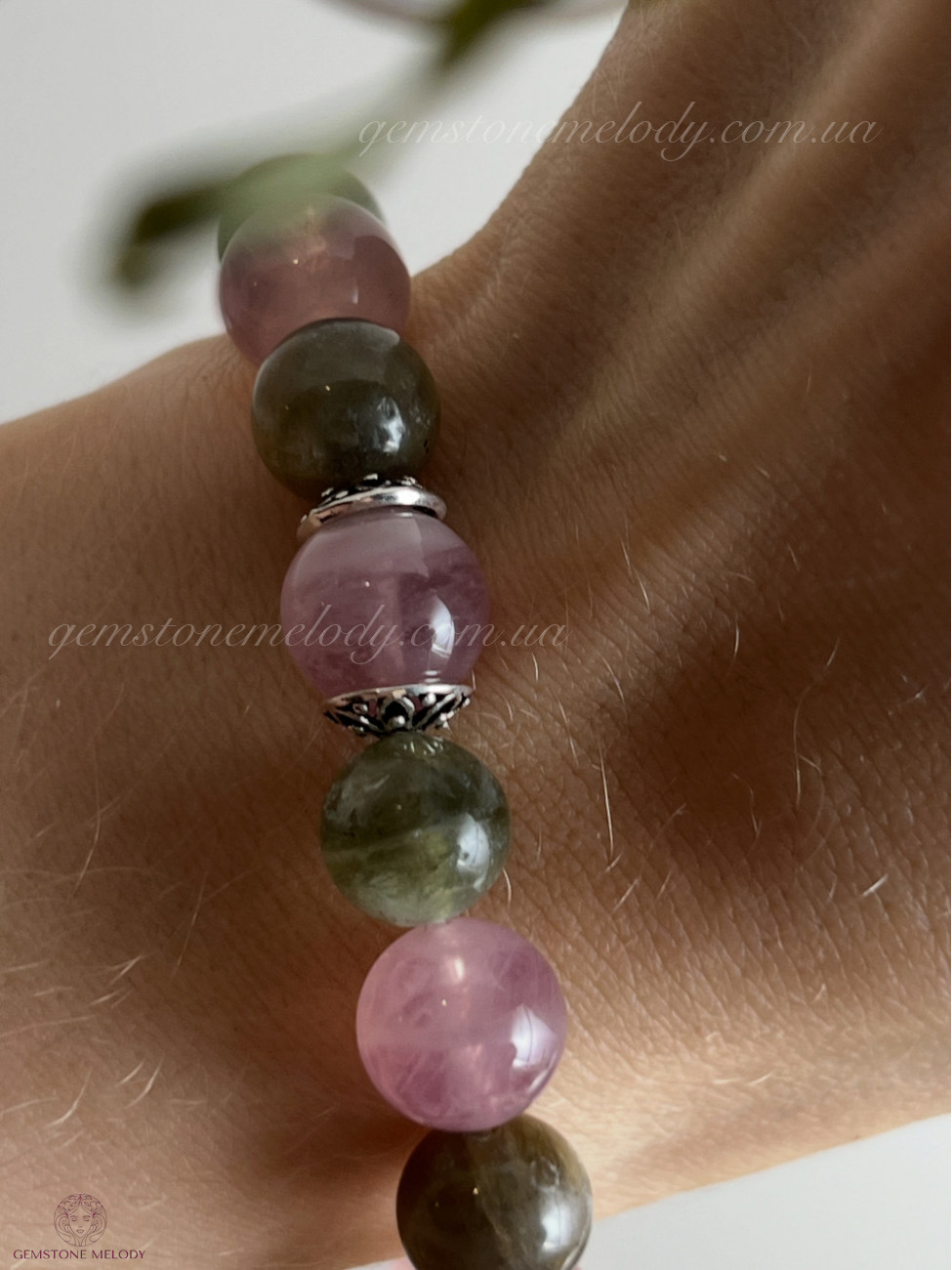 Браслет з рожевим кварцем та лепідолітом і з сапфіром