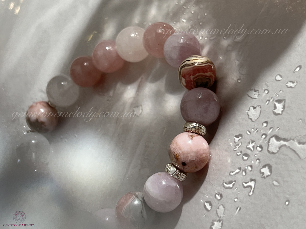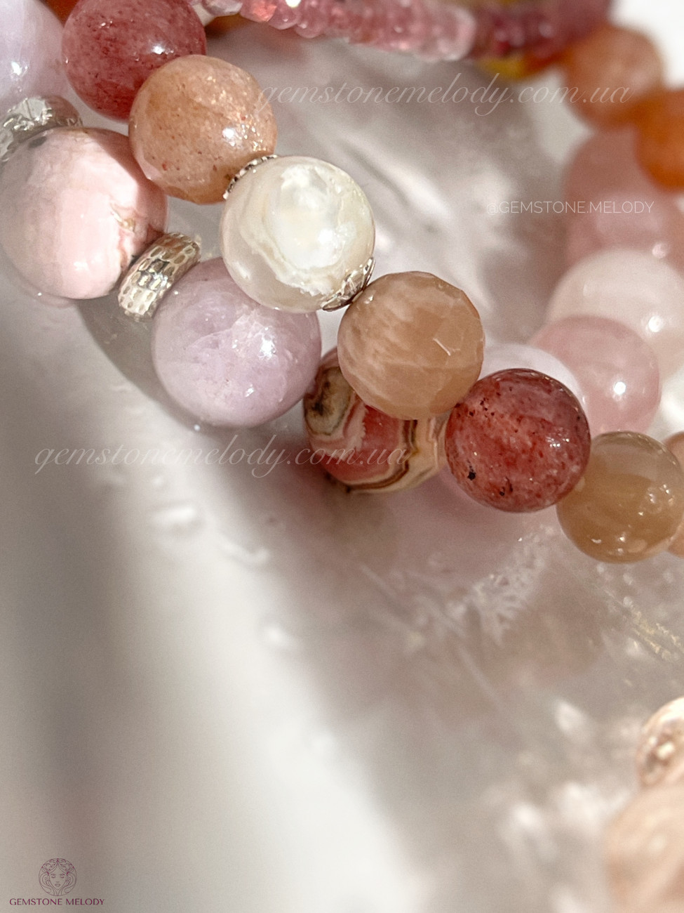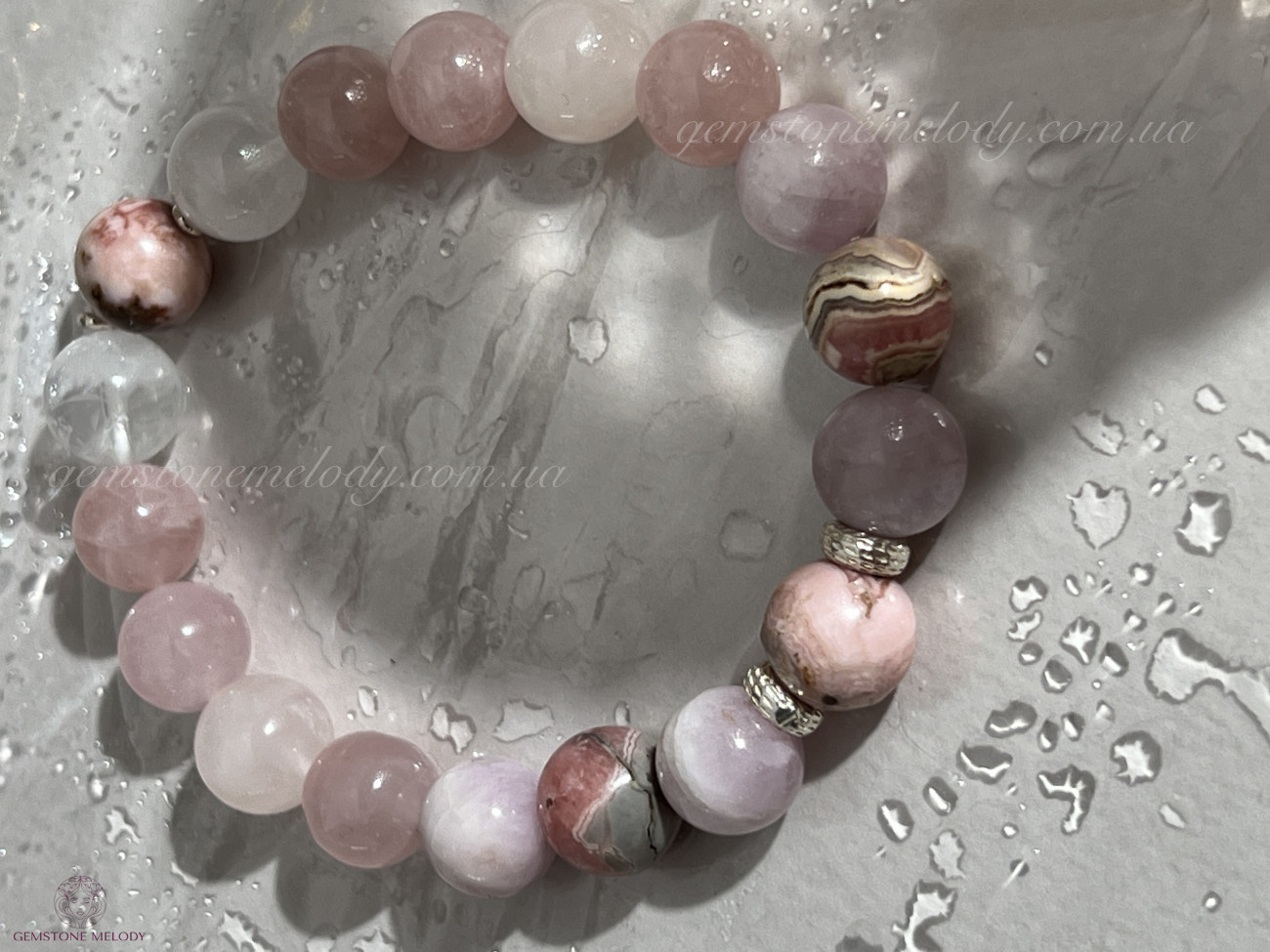 родохрозит 10мм, кунцит 10мм, рожевий кварц 9мм, кварц 10мм, родоніт 10мм, срібло 925 проби;