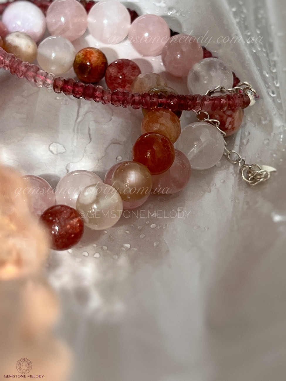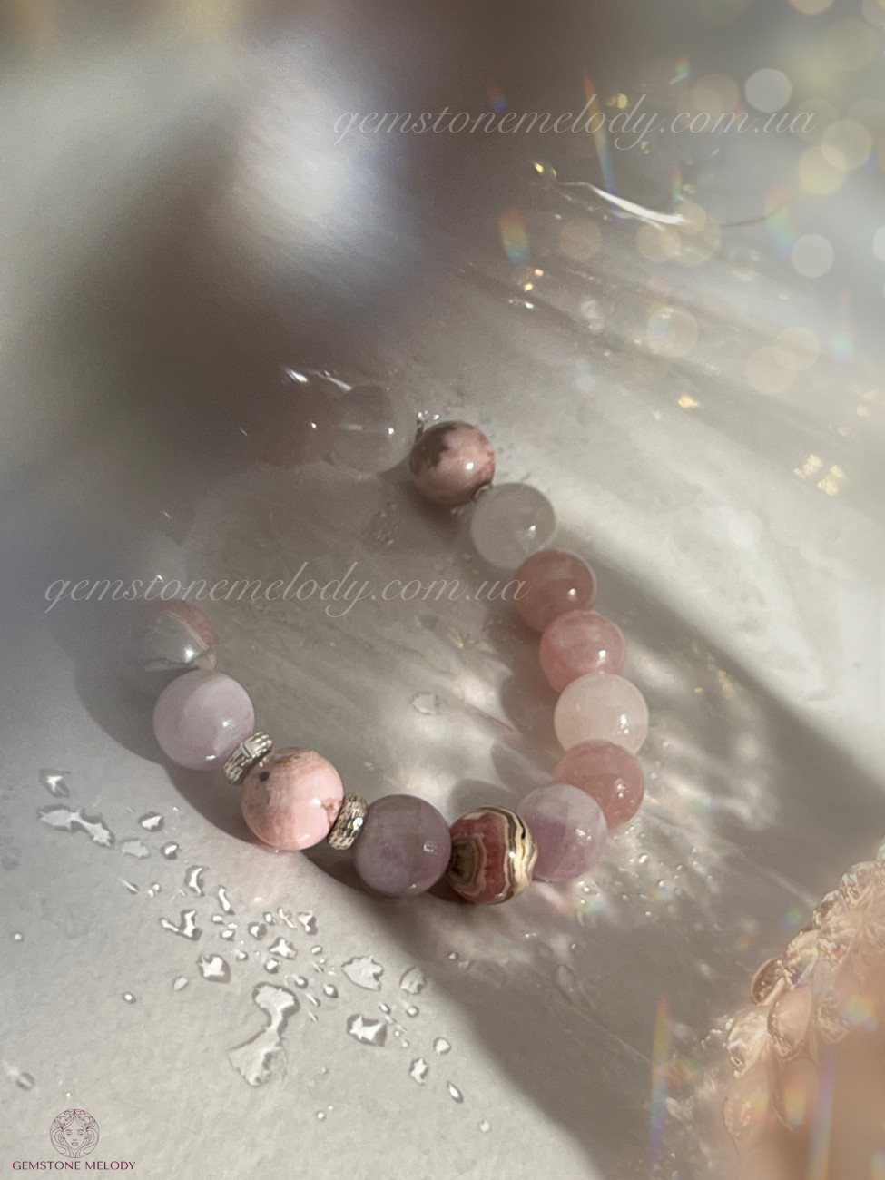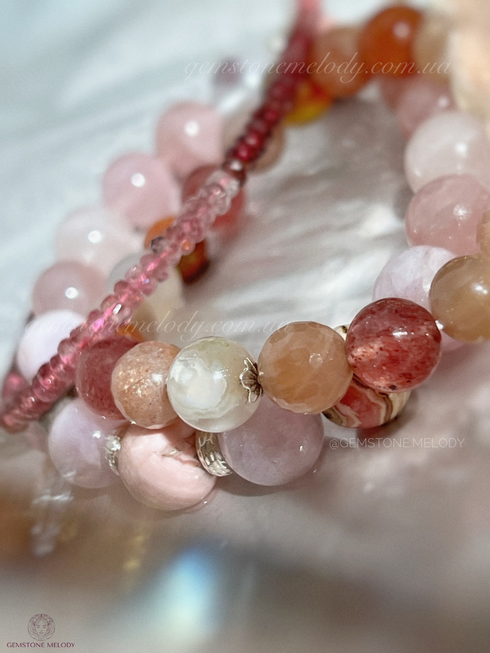 родохрозит 10мм, кунцит 10мм, рожевий кварц 9мм, кварц 10мм, родоніт 10мм, срібло 925 проби;