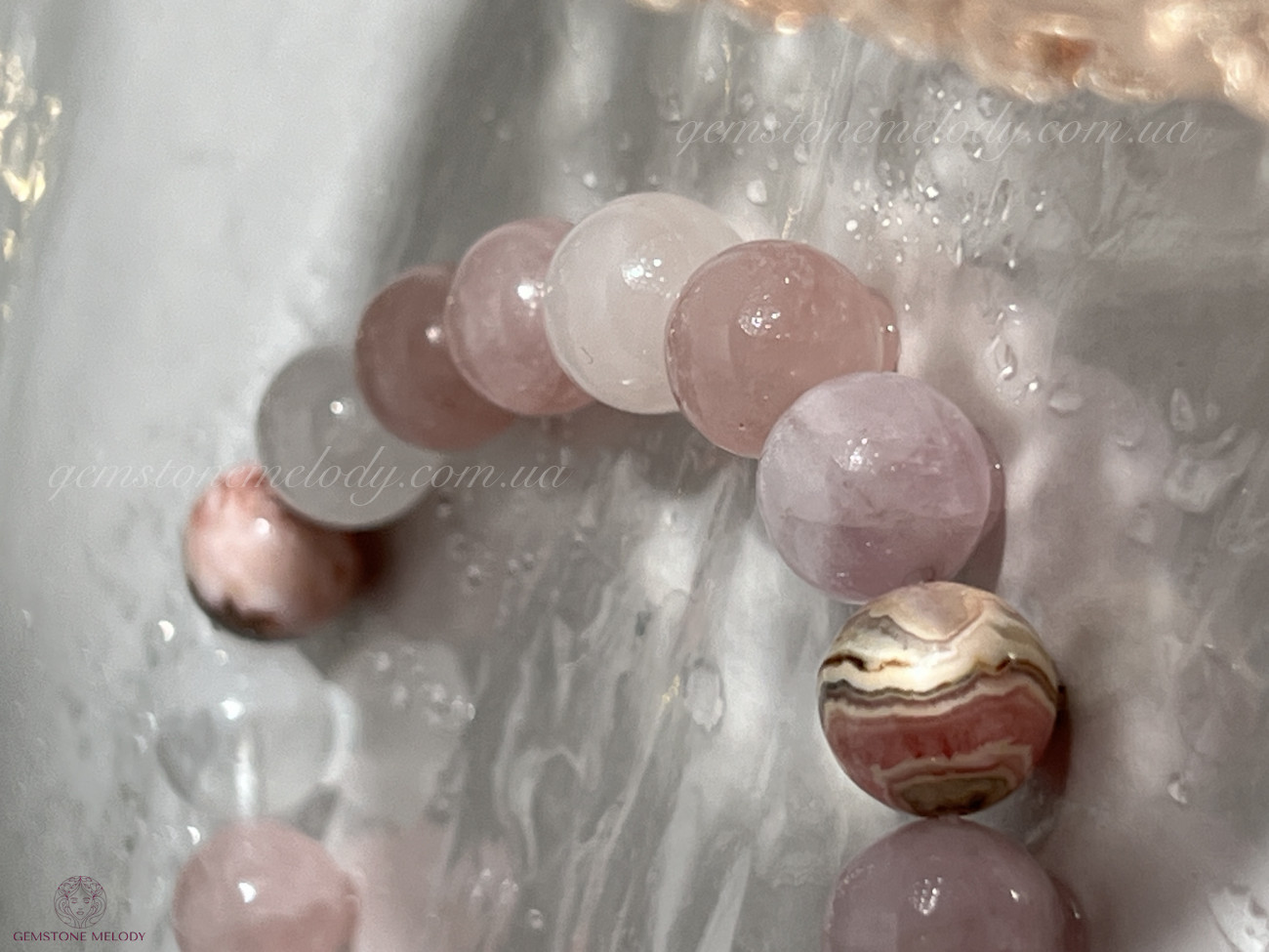 Браслет з рожевого кварцу, родохрозита, родоніта, гірського кришталя