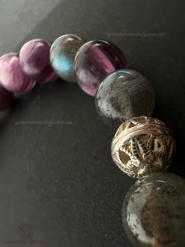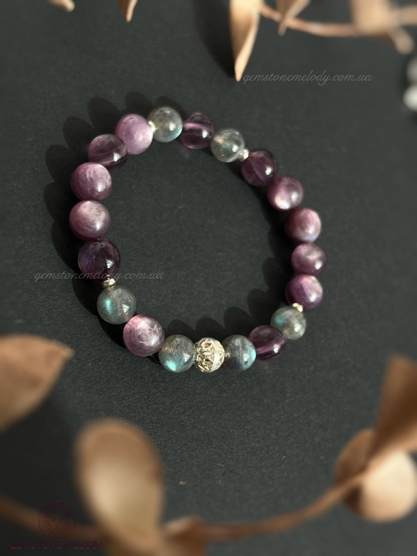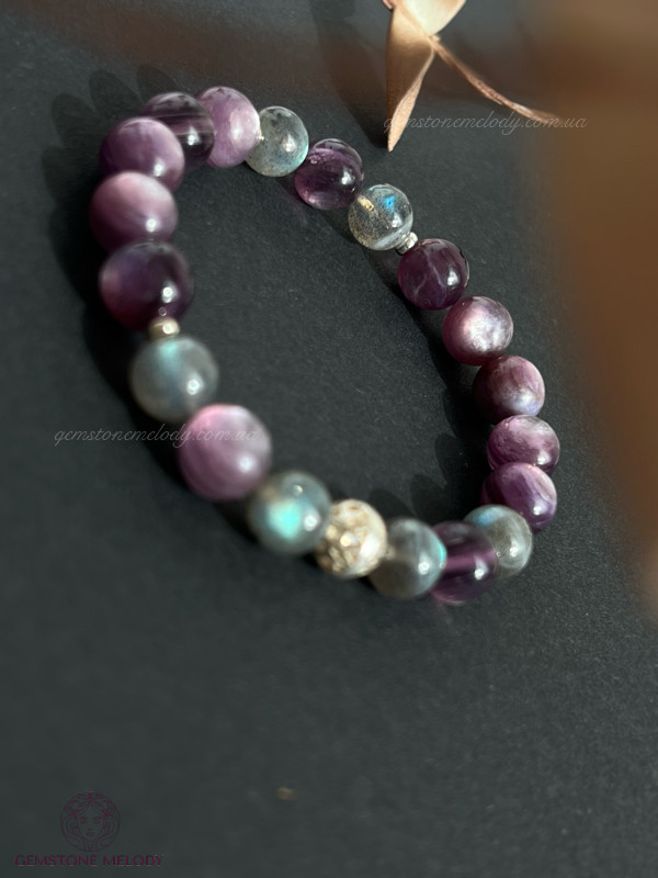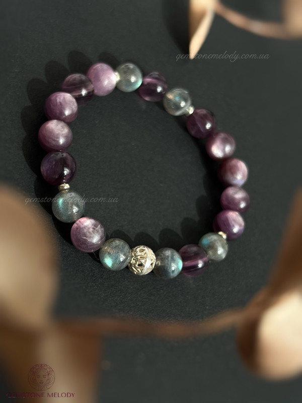 В браслеті: лепідоліт 9мм, лабрадор 8,5мм, срібло 925 проби; на резинці;