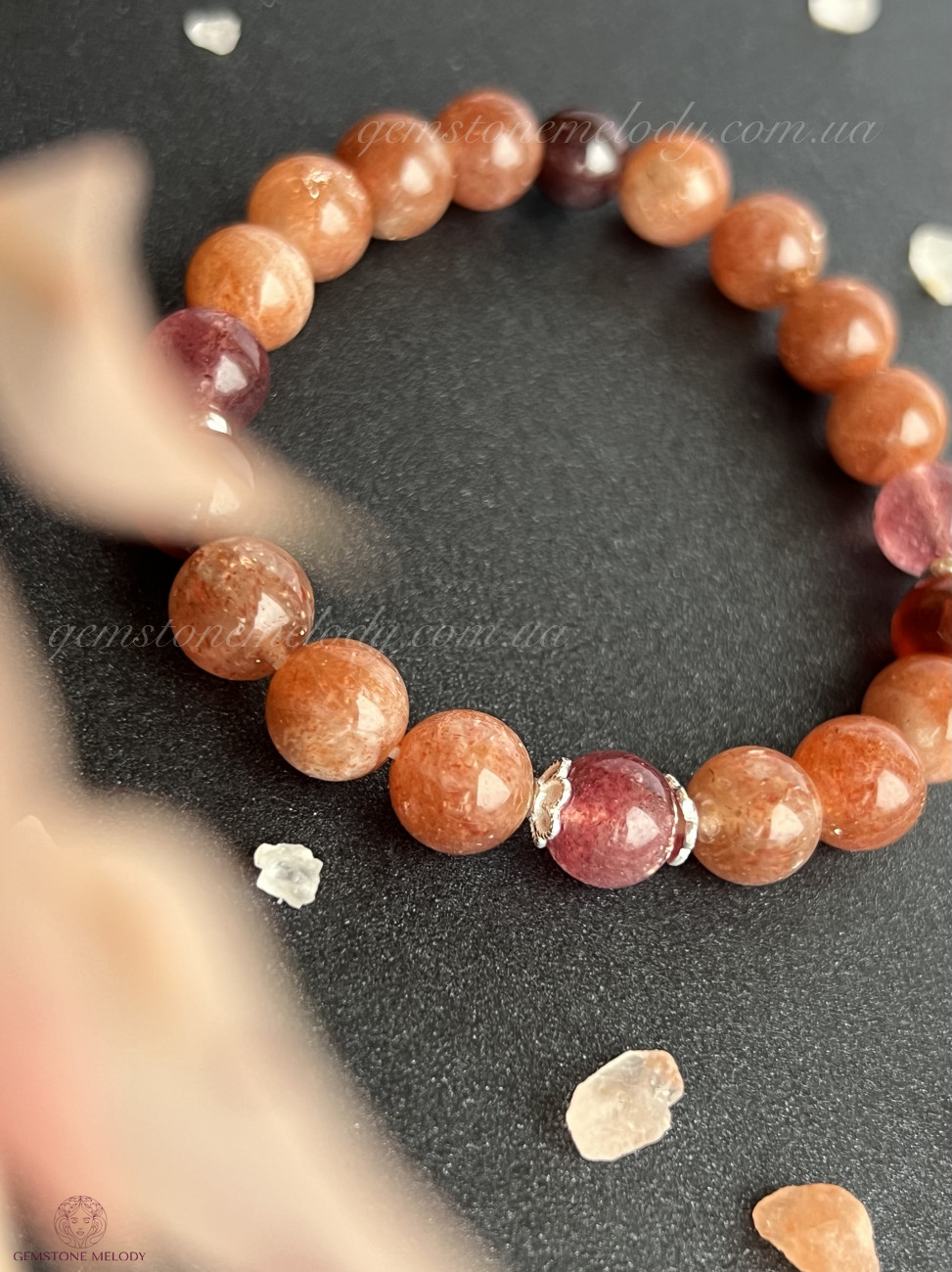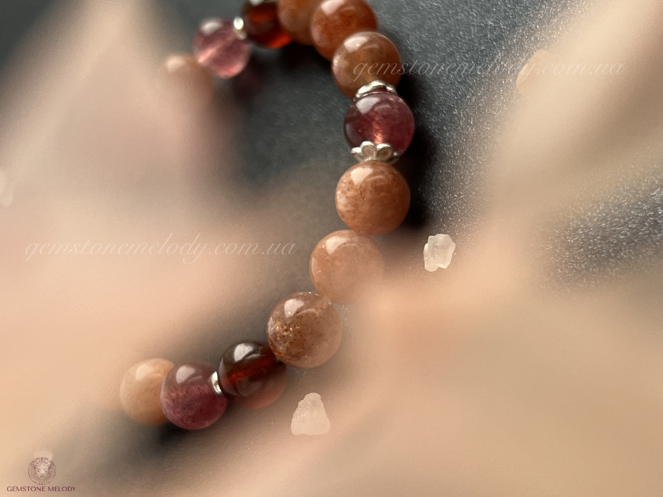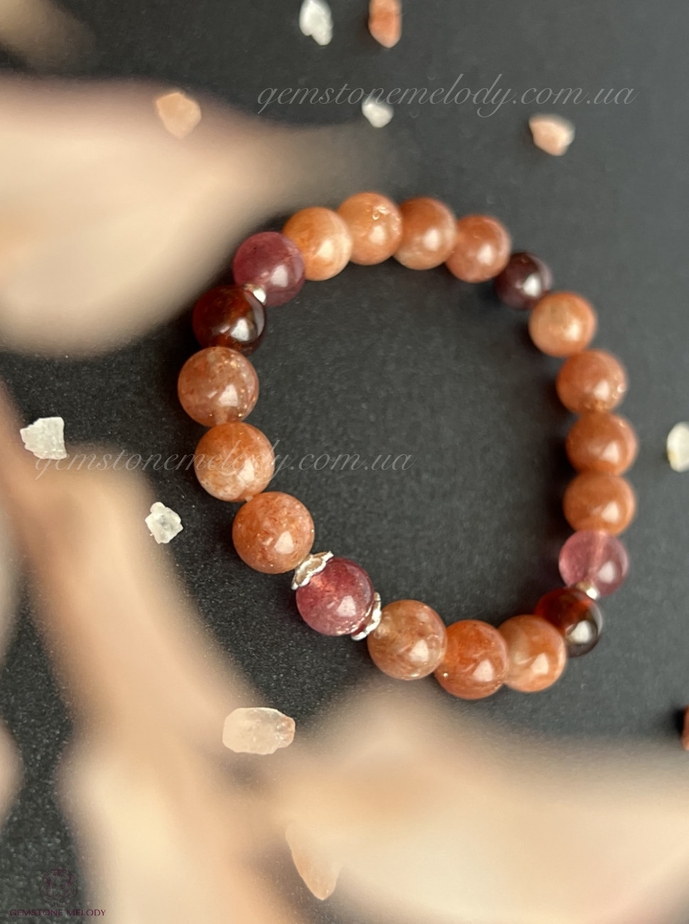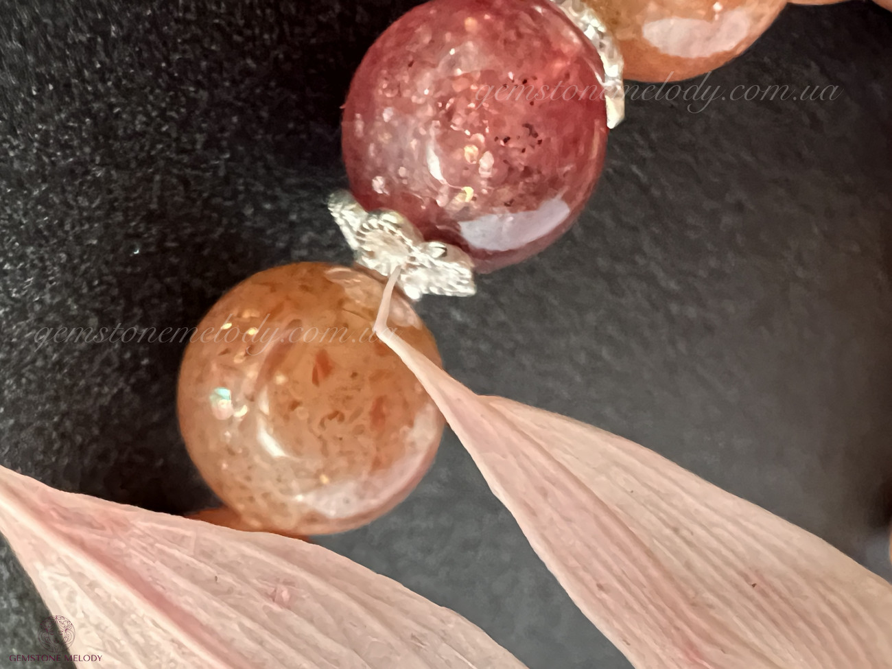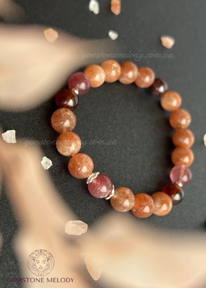сонячний камінь 8мм високої якості, гранат високої якості 7,5мм, полуничний кварц 7, 5мм високої якості;