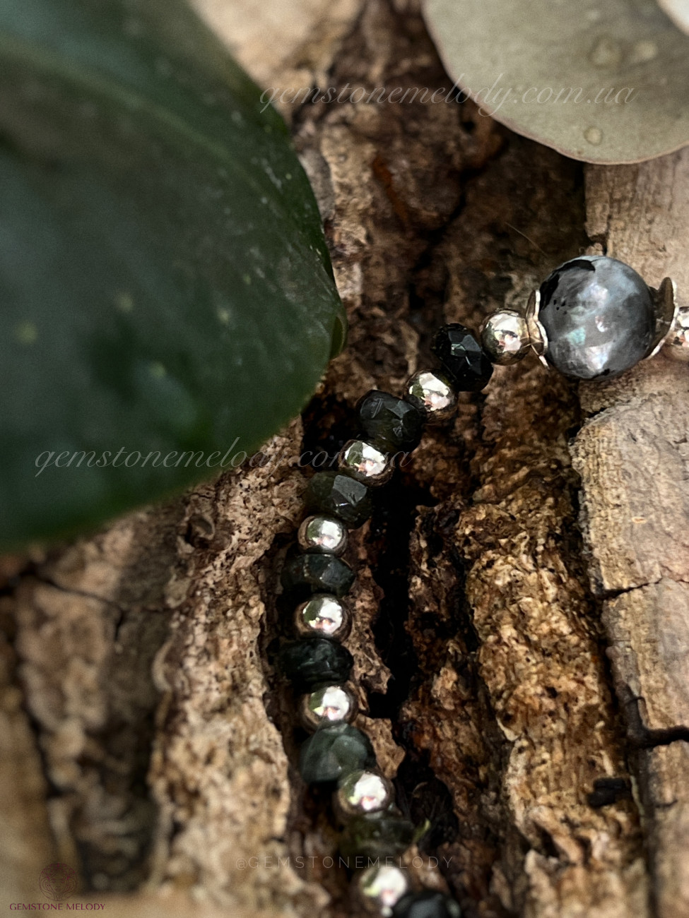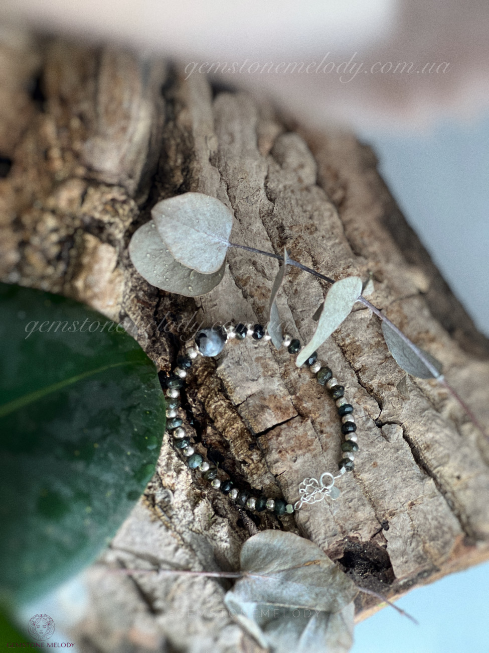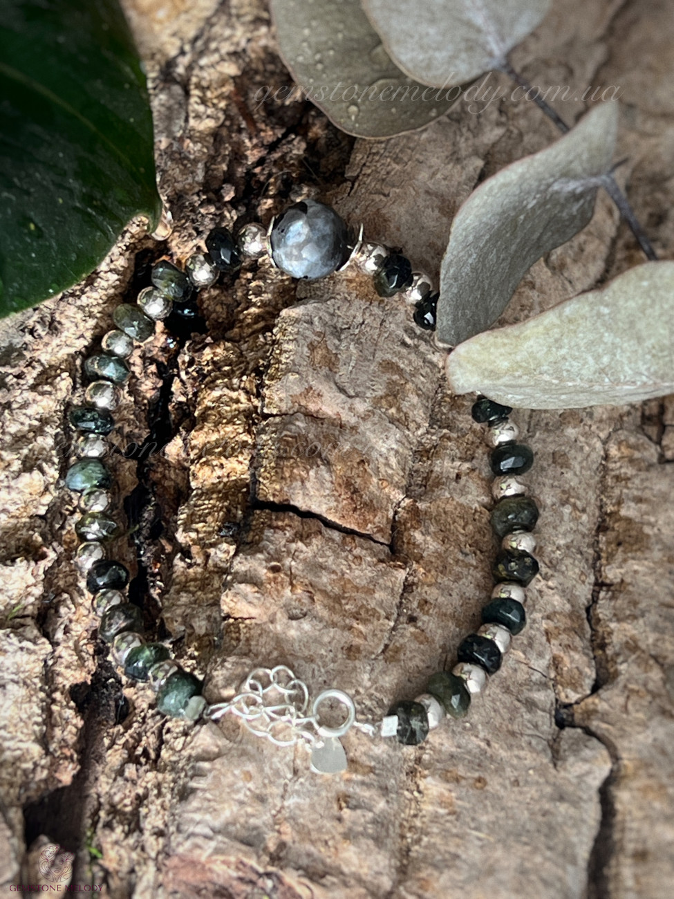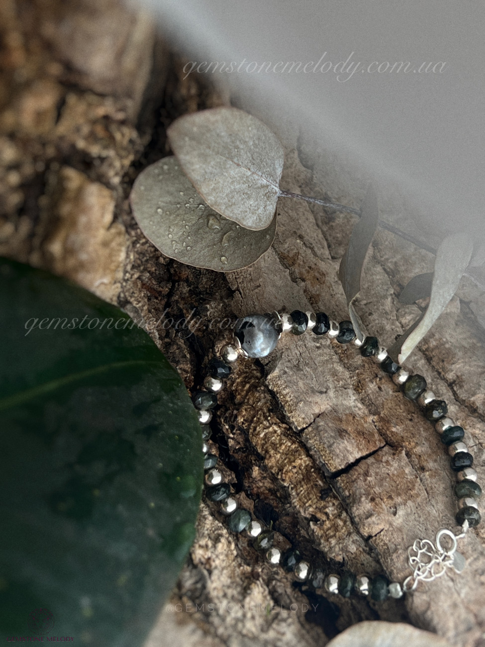 тоненький браслет з темним турмаліном 3*5мм, посередині темний сонячний камінь 8,5мм;