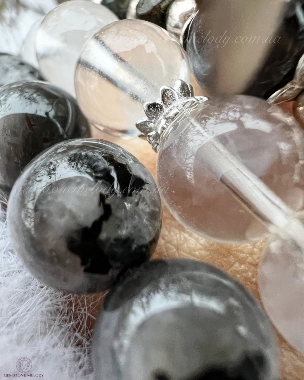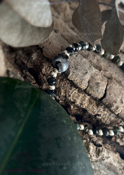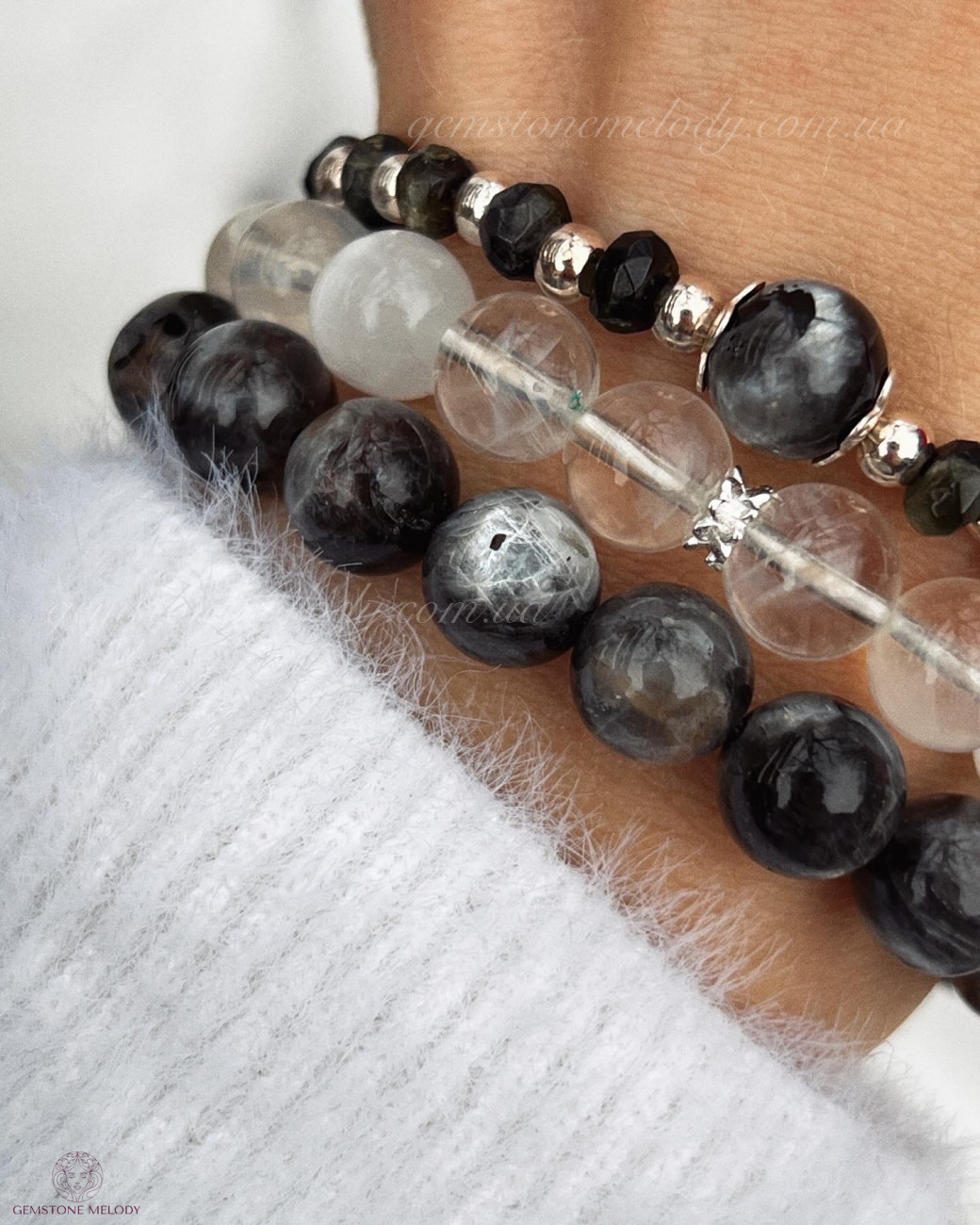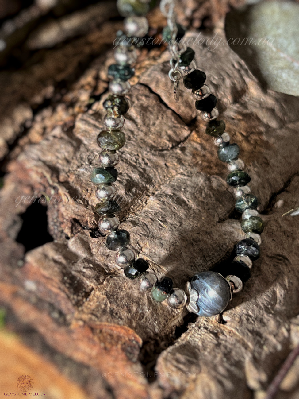 тоненький браслет з темним турмаліном 3*5мм, посередині темний сонячний камінь 8,5мм;