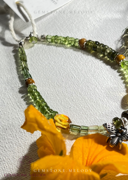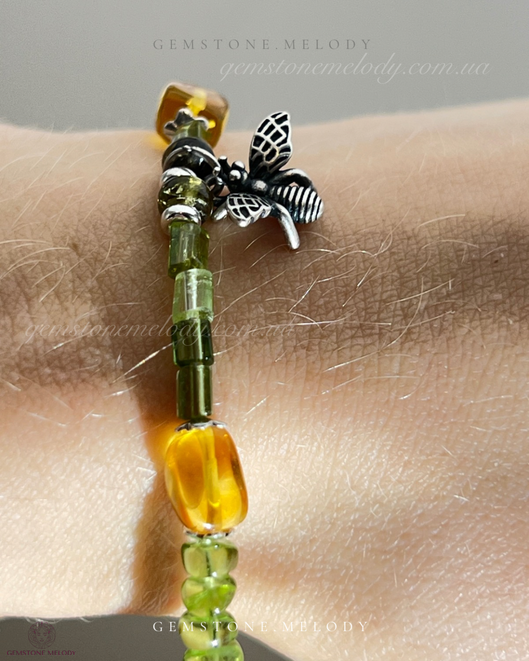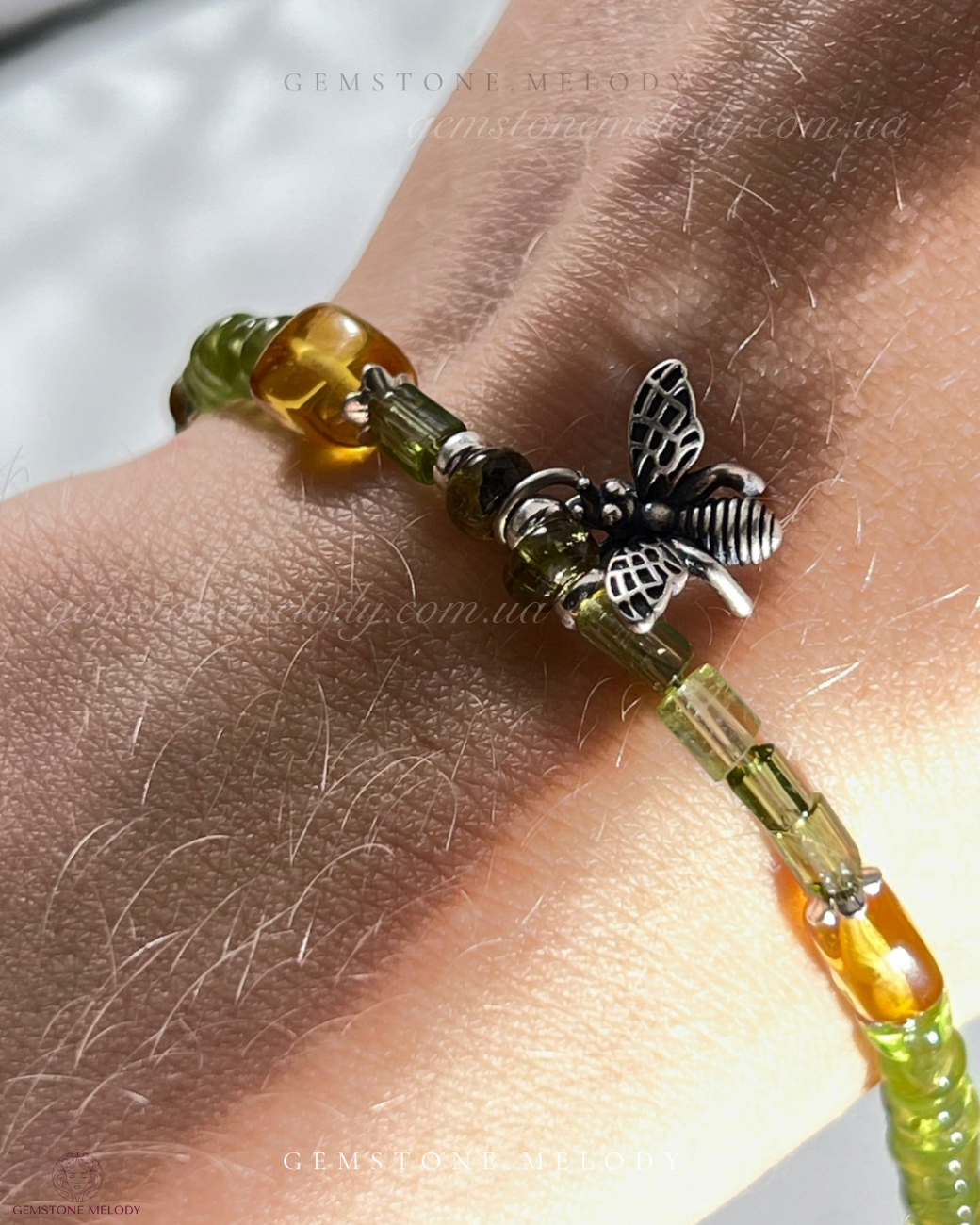 Браслет з зеленого турмаліну двох видів , вставки бурштину