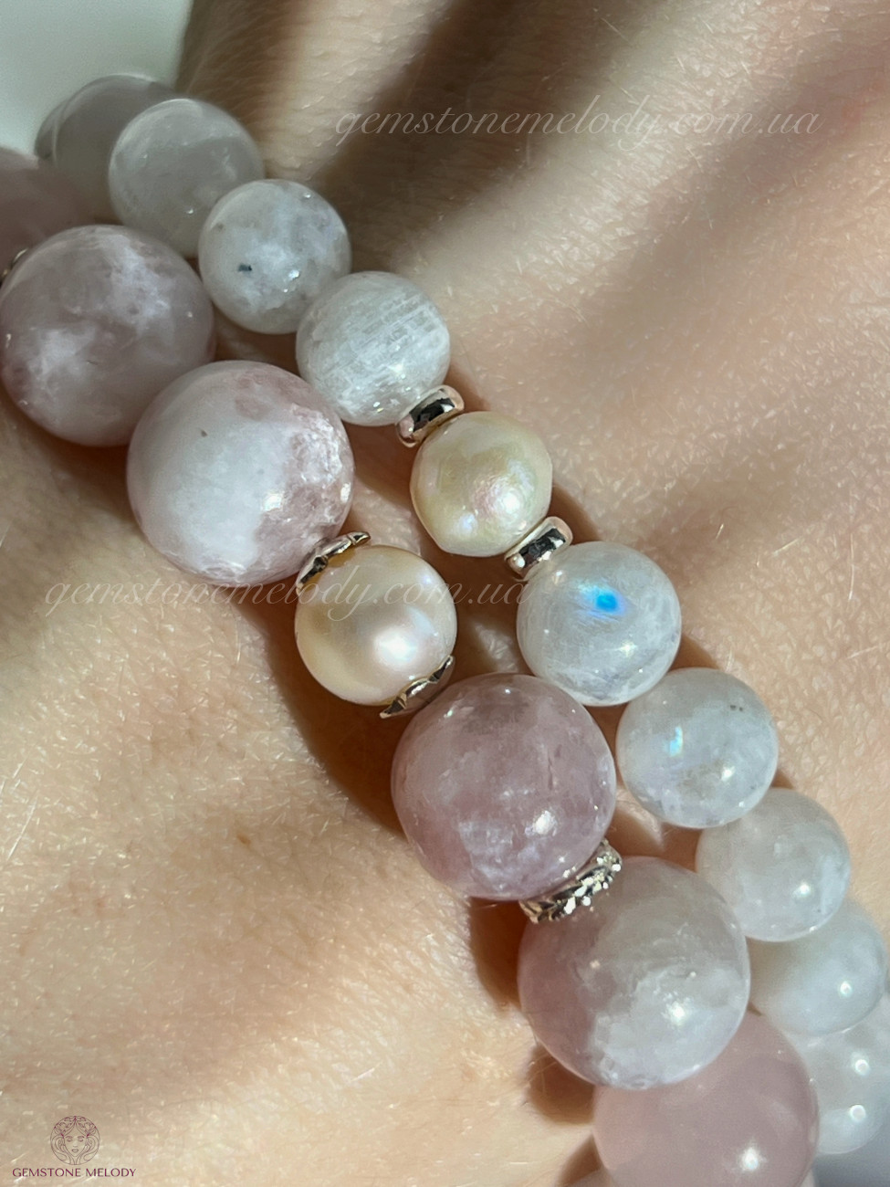 В браслеті: місячний камінь 8мм; вставка перлини; фурнітура срібло 925 проби; на резинці; 850 грн