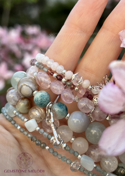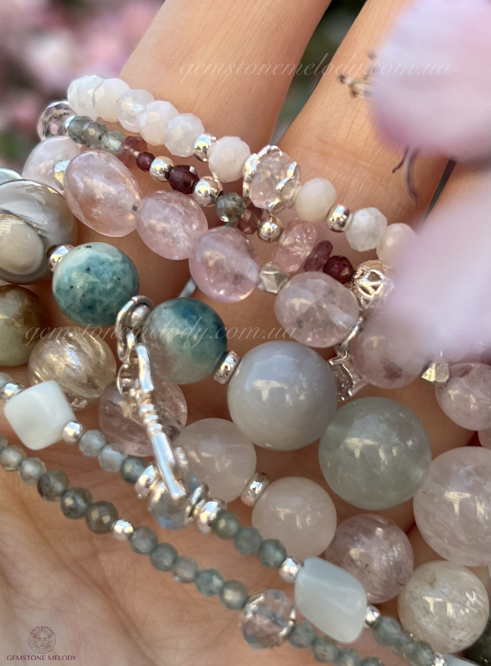 різновид содаліту 7мм, аквамарин 10мм, кварц 11мм, агат 10мм, лабрадор 8мм; на різинці;
